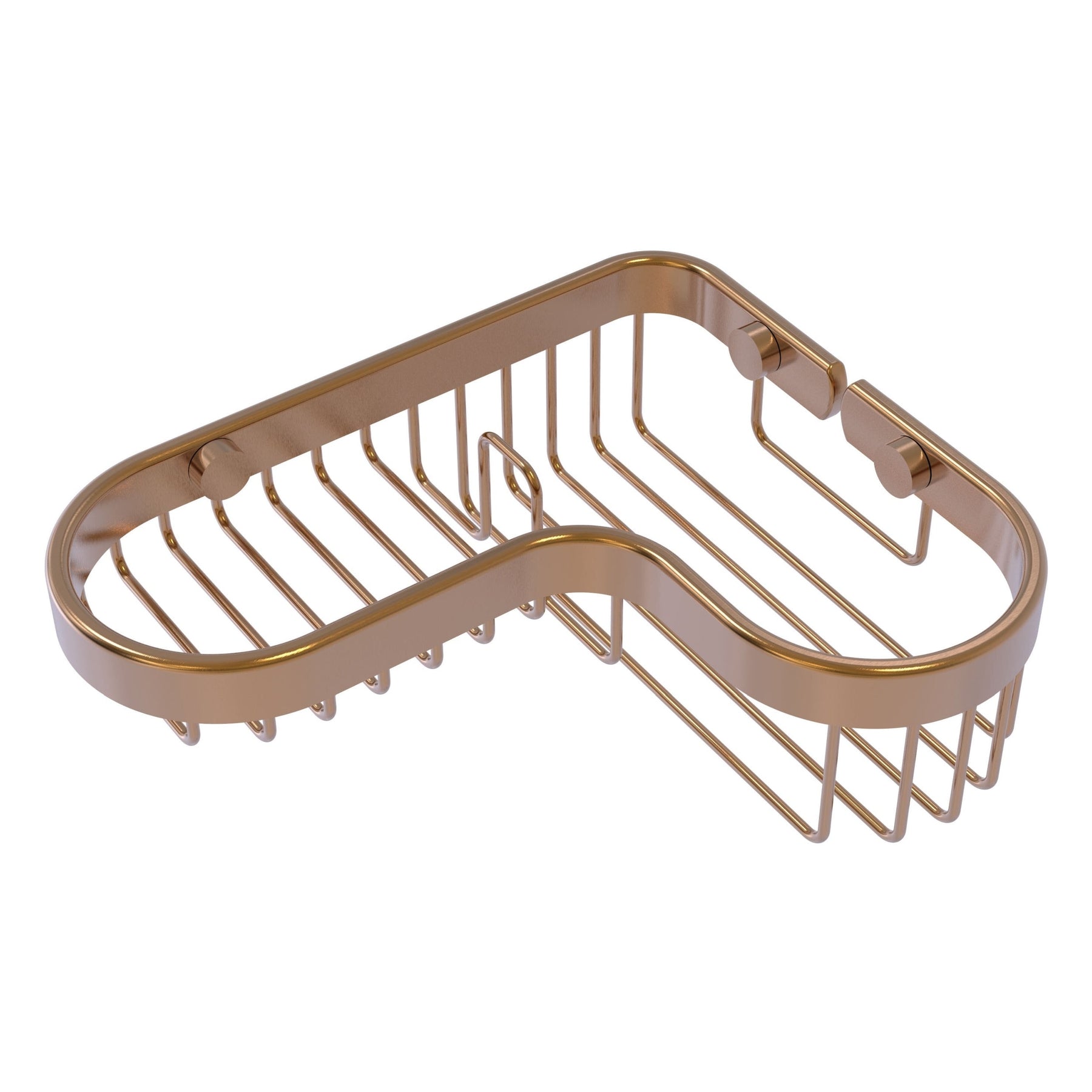 A solid brass corner combination shower basket designed to organize soaps and bottles while draining quickly. Its heavy-gauge, ventilated wires resist rust, and the antique bronze designer finish adds enduring style to any bath.