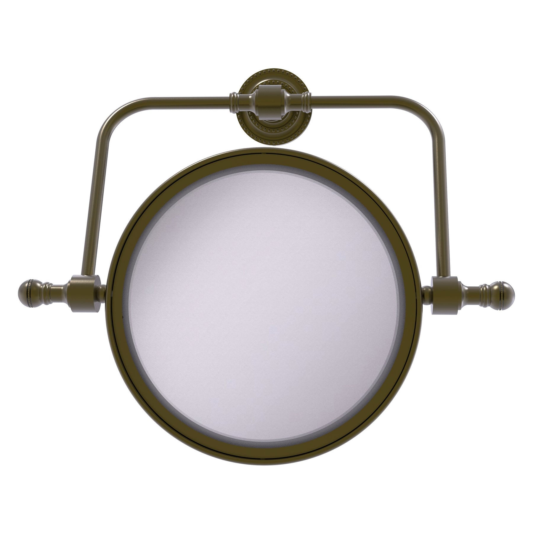 A compact, wall-mounted vanity mirror from Allied Brass’ Retro Dot collection, crafted from solid brass with an antique finish. The 8-in double-faced mirror offers 2x magnification on one side and pivots for flexible viewing, making it ideal for makeup and grooming.