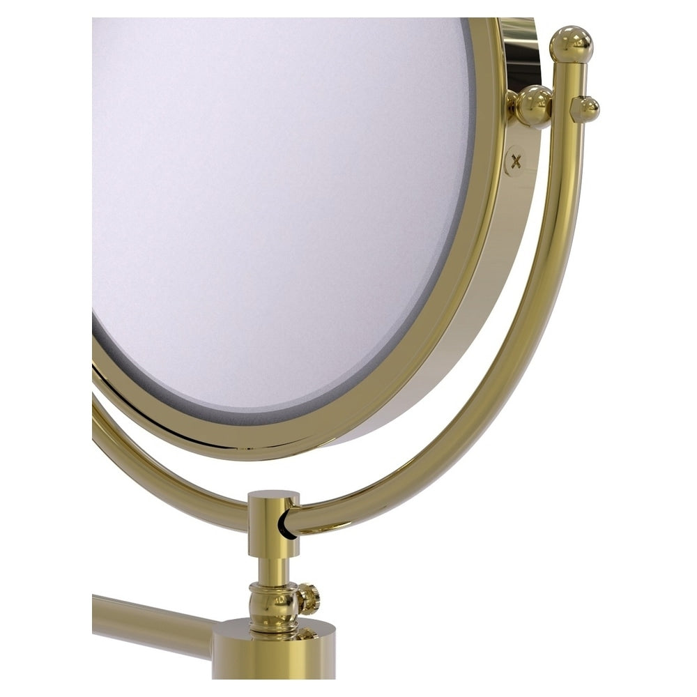 A sleek, wall-mounted makeup mirror crafted from solid brass with a polished brass finish. The double-sided 8-inch mirror offers clear viewing with 5x magnification on one side, and pivots and extends for flexible angles while saving counter space.