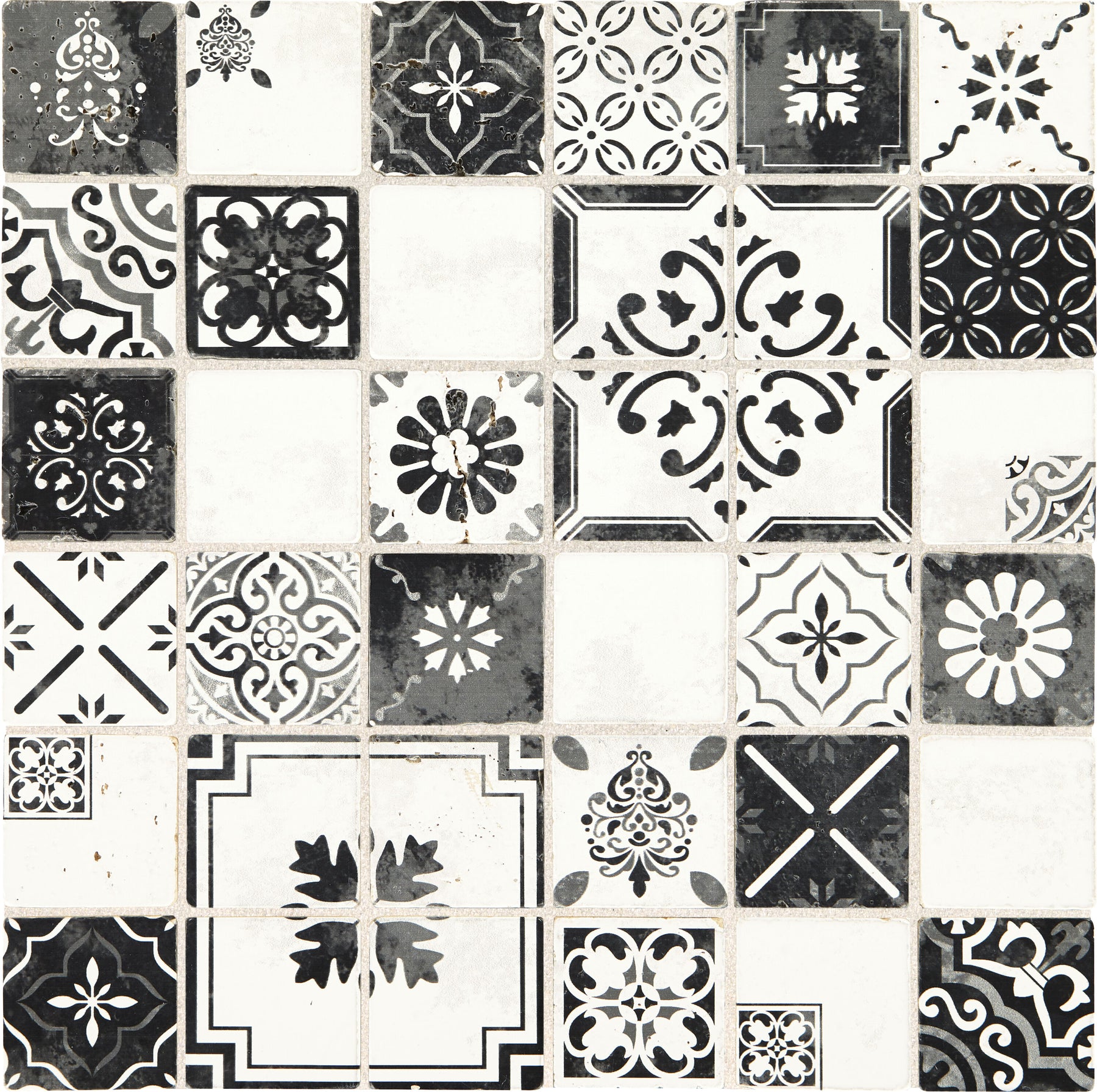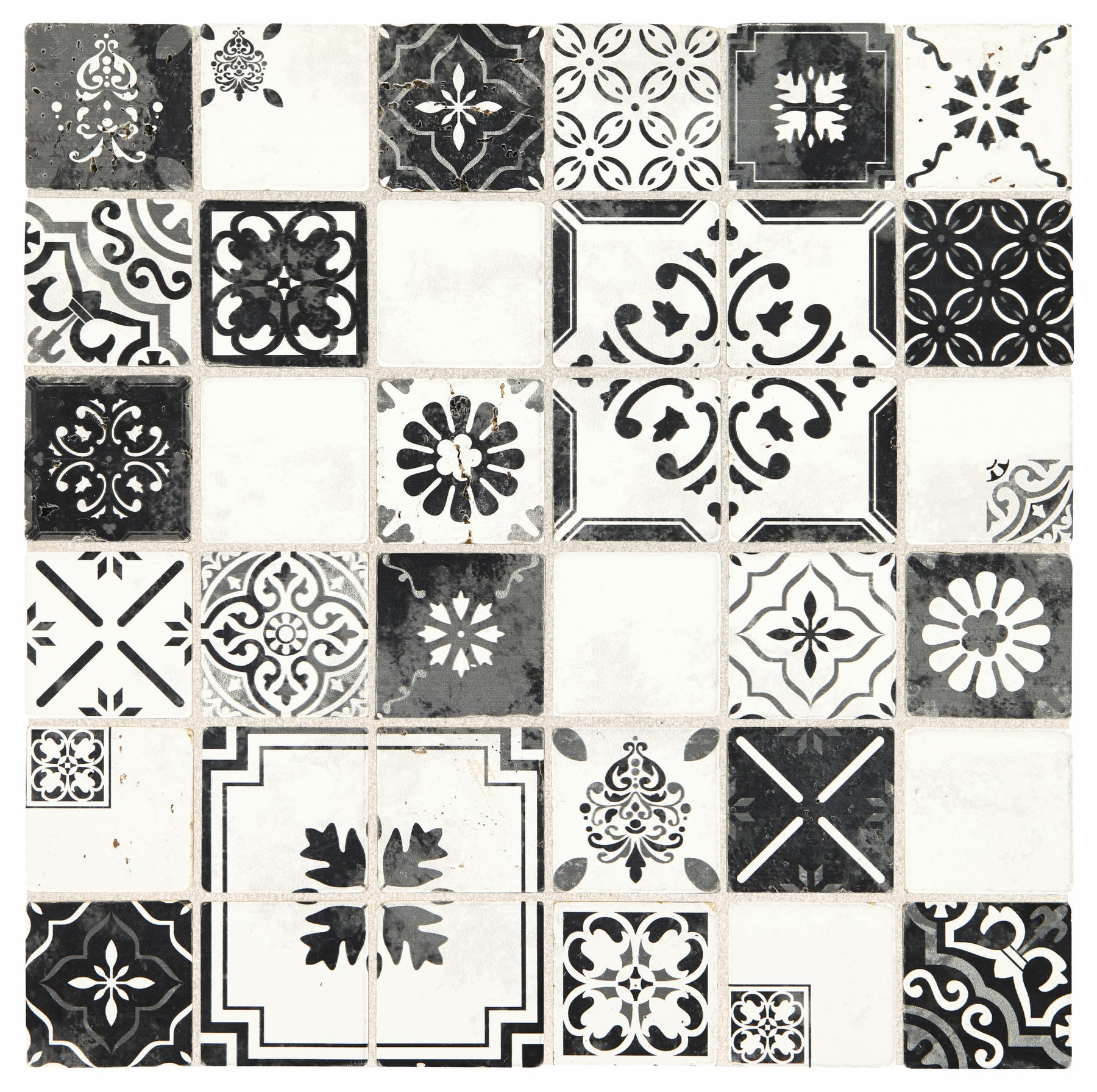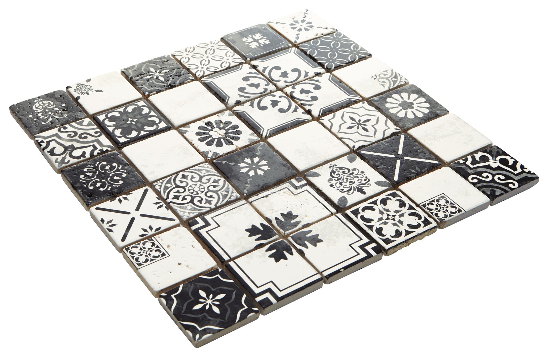 Bring artisanal pattern to backsplashes and feature walls with this glazed natural travertine mosaic from American Olean’s Genuine Stone collection. The 12-in x 12-in sheet features a mix of black-and-white Moroccan-inspired motifs on mesh backing for easy installation, ideal for indoor walls and fireplace facades.