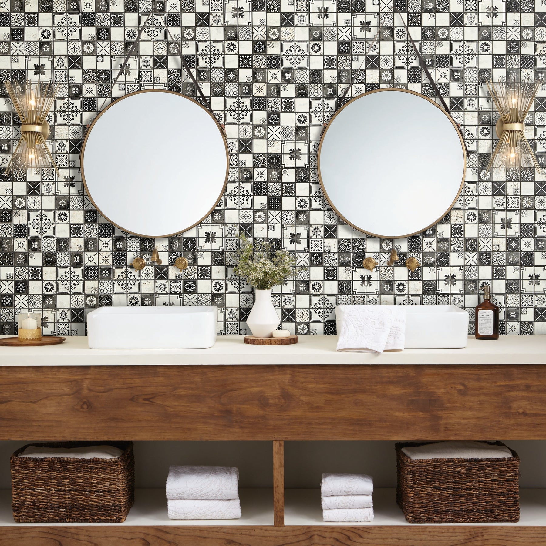 This mosaic brings a spirited dance of black and white to the wall—ornamental, storied, and effortlessly chic. I love the mix of patterns across natural travertine; it adds texture and patina that feels collected over time. Run it full-height behind a vanity or slice it into bands to frame open shelving for a couture moment. It’s a sumptuous statement that instantly elevates everyday living.