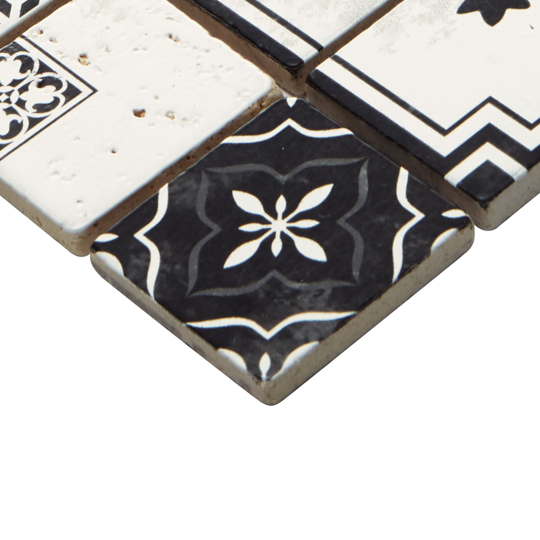 • Decorative Natural Stone: Travertine mosaic with Moroccan black-and-white encaustic-style patterns
