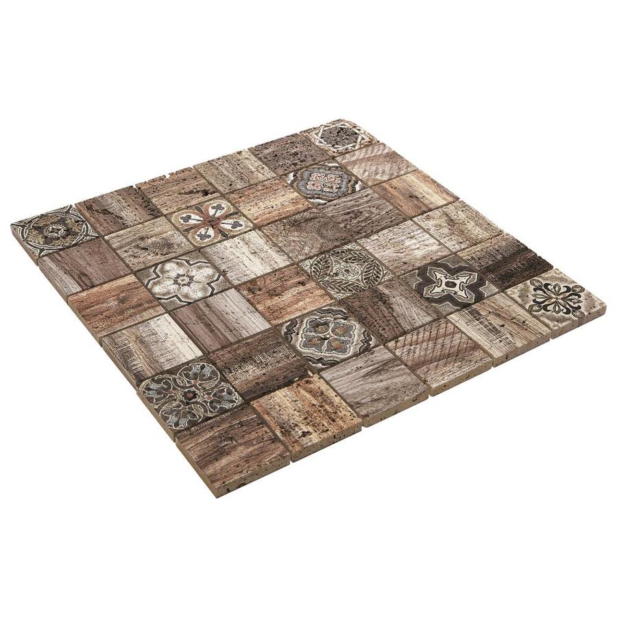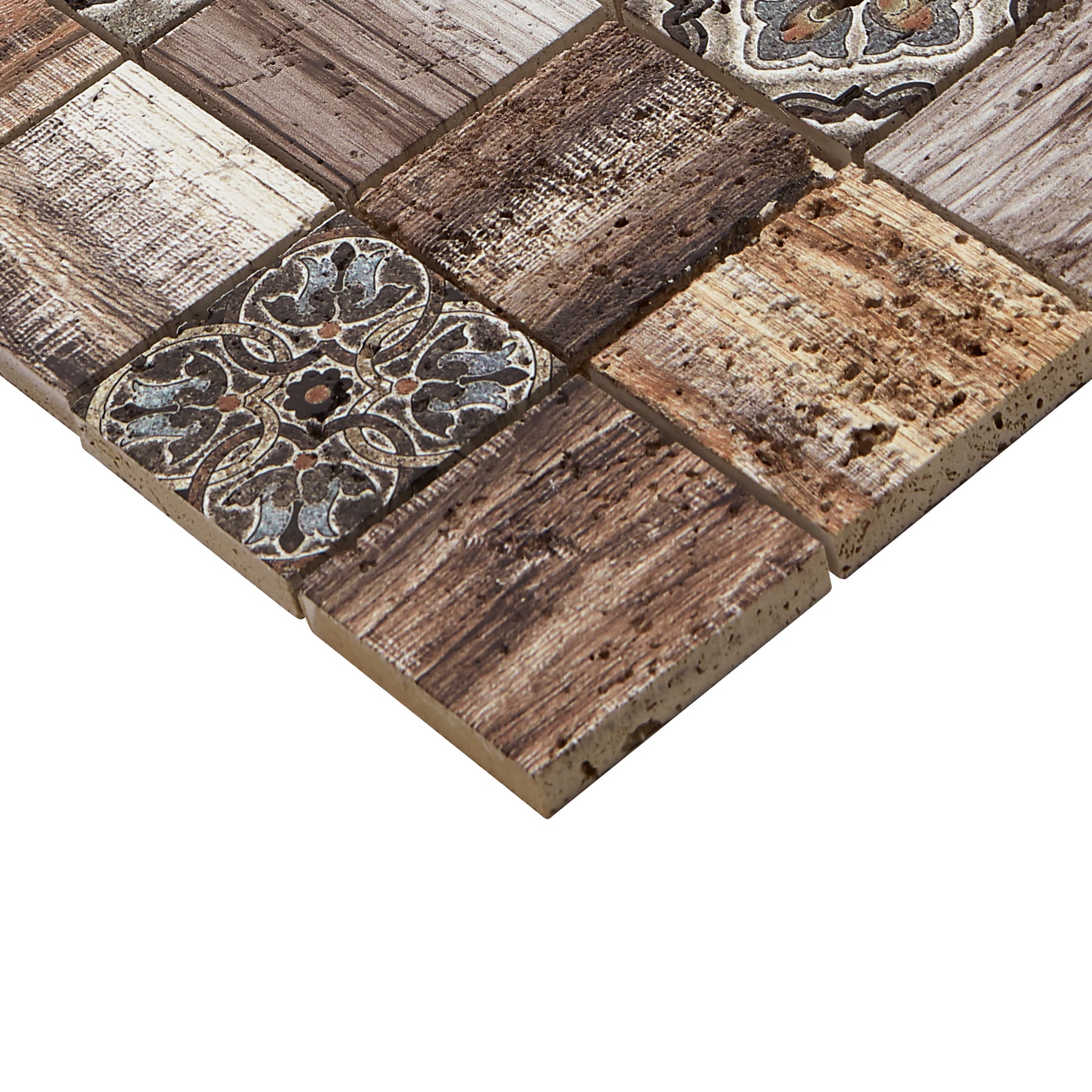 A natural travertine mosaic tile featuring Moroccan-inspired patterns and wood-look textures. Mesh-mounted squares simplify installation for striking backsplashes and fireplace facades. Designed for indoor wall use only.