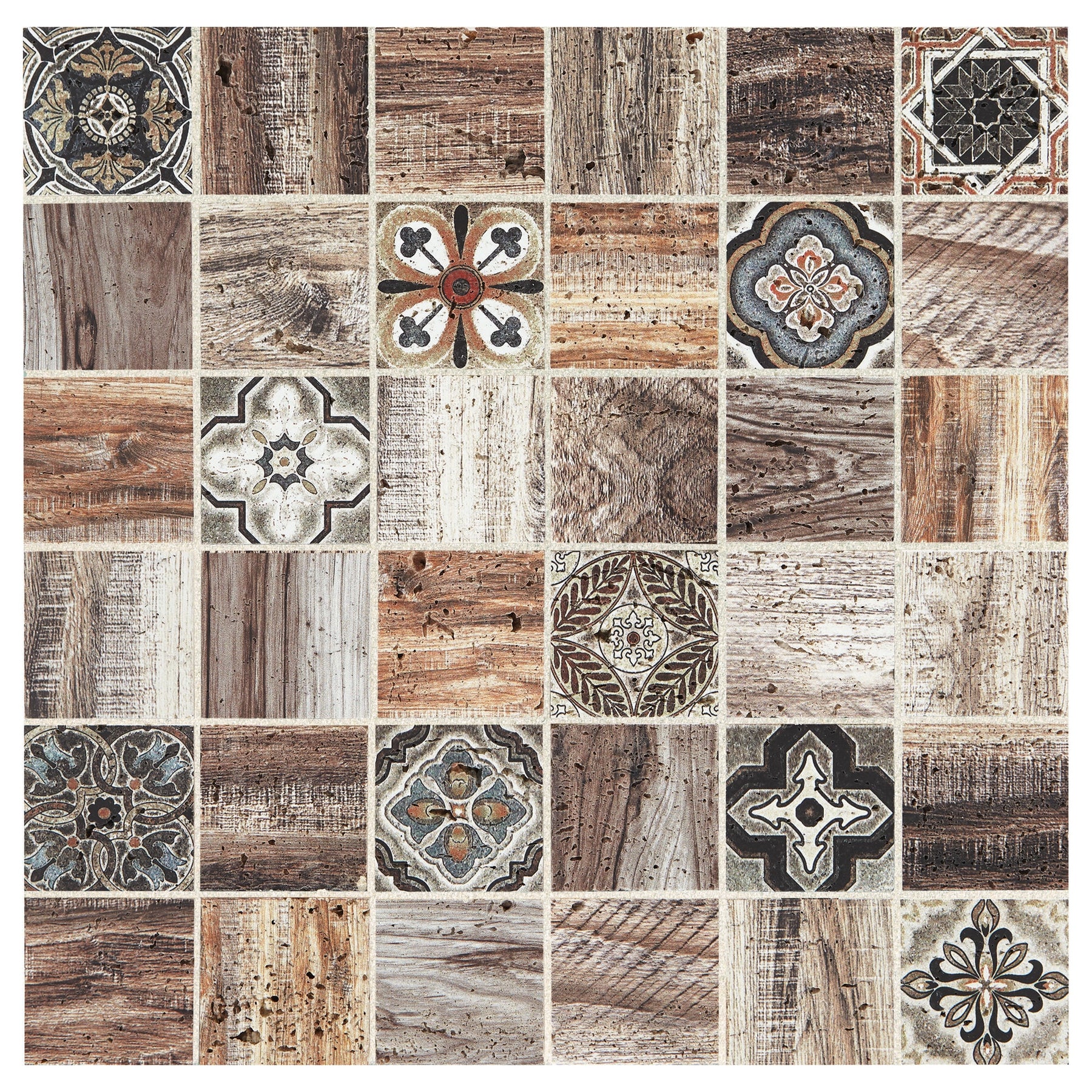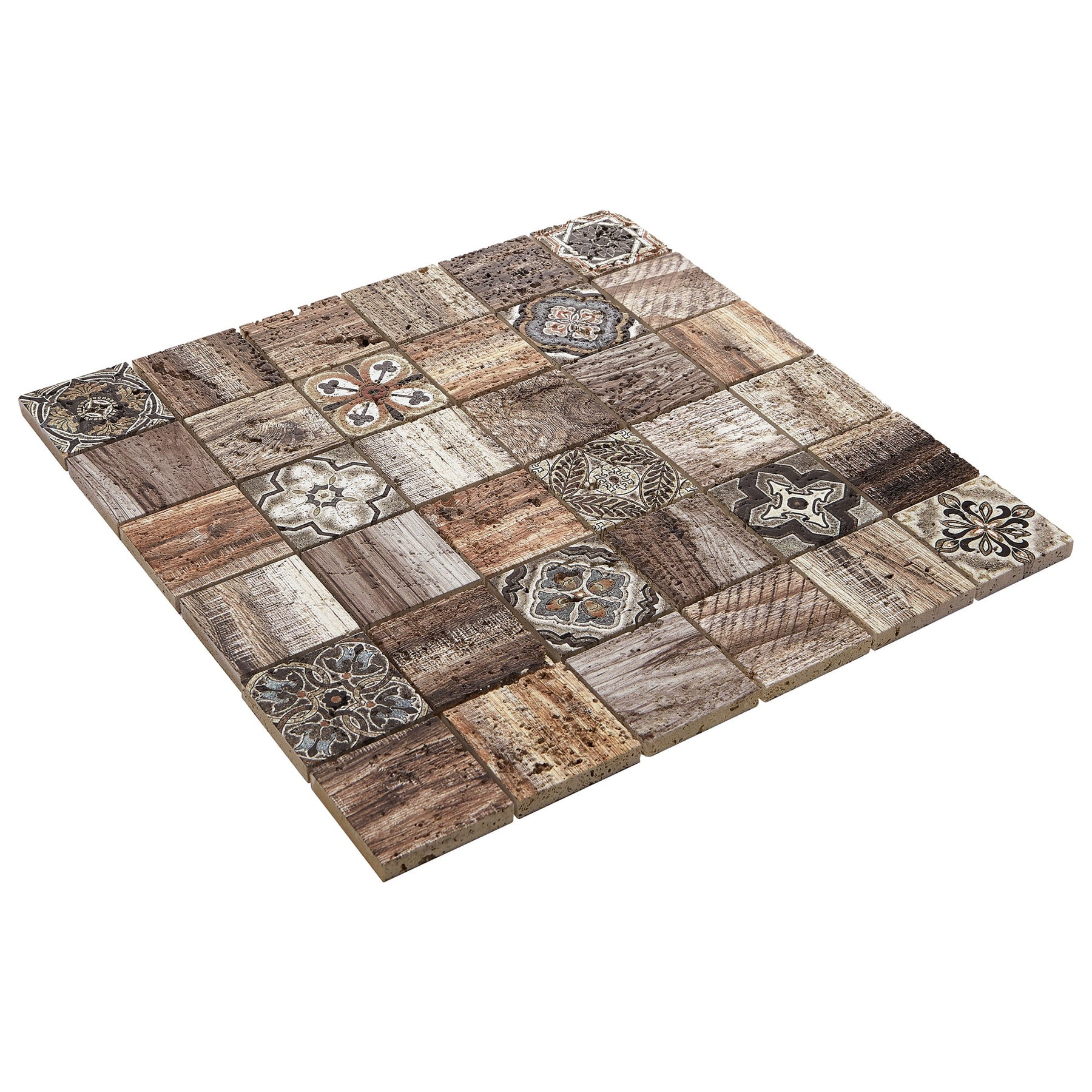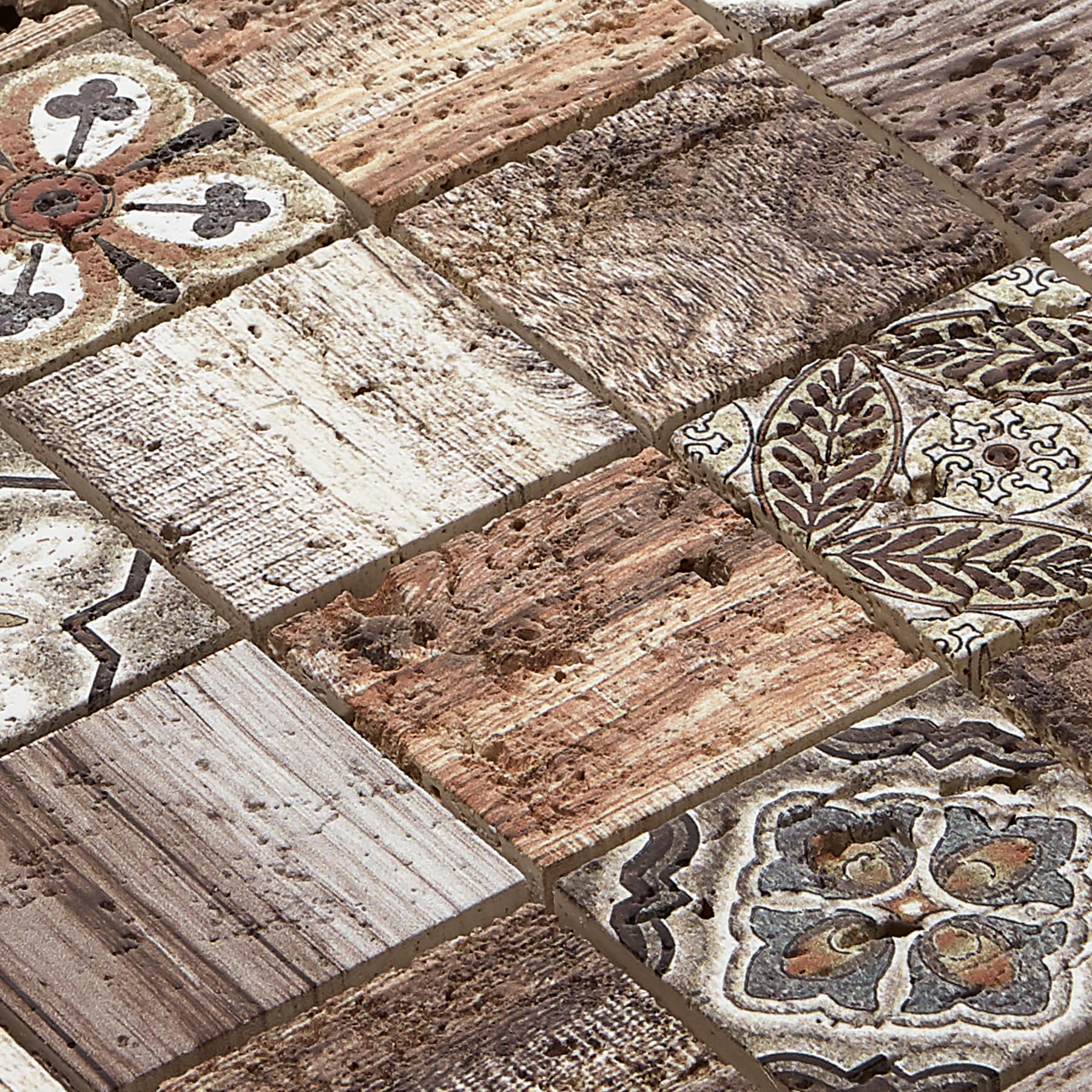 This mosaic breathes artisanal warmth into a room, blending Moroccan motifs with the tactile richness of natural travertine. The wood‑look accents add depth and texture, creating a layered, collected aesthetic. Style it as a full-height backsplash to frame stainless appliances or pair with matte black hardware for a refined contrast. It’s a quietly luxurious statement that elevates everyday living.