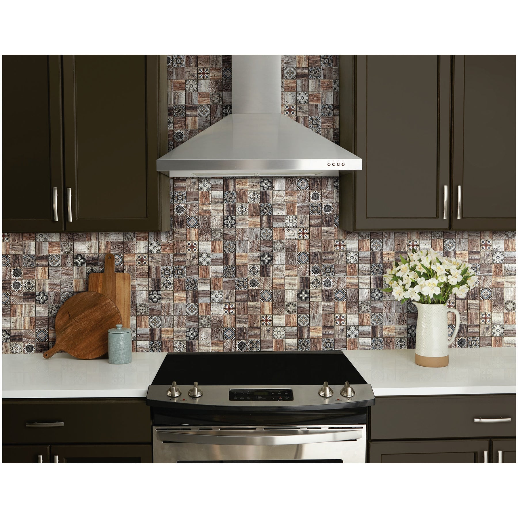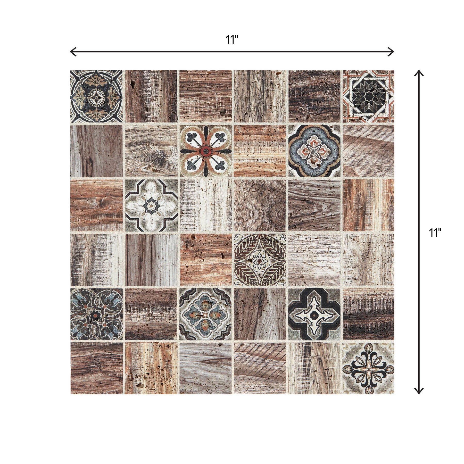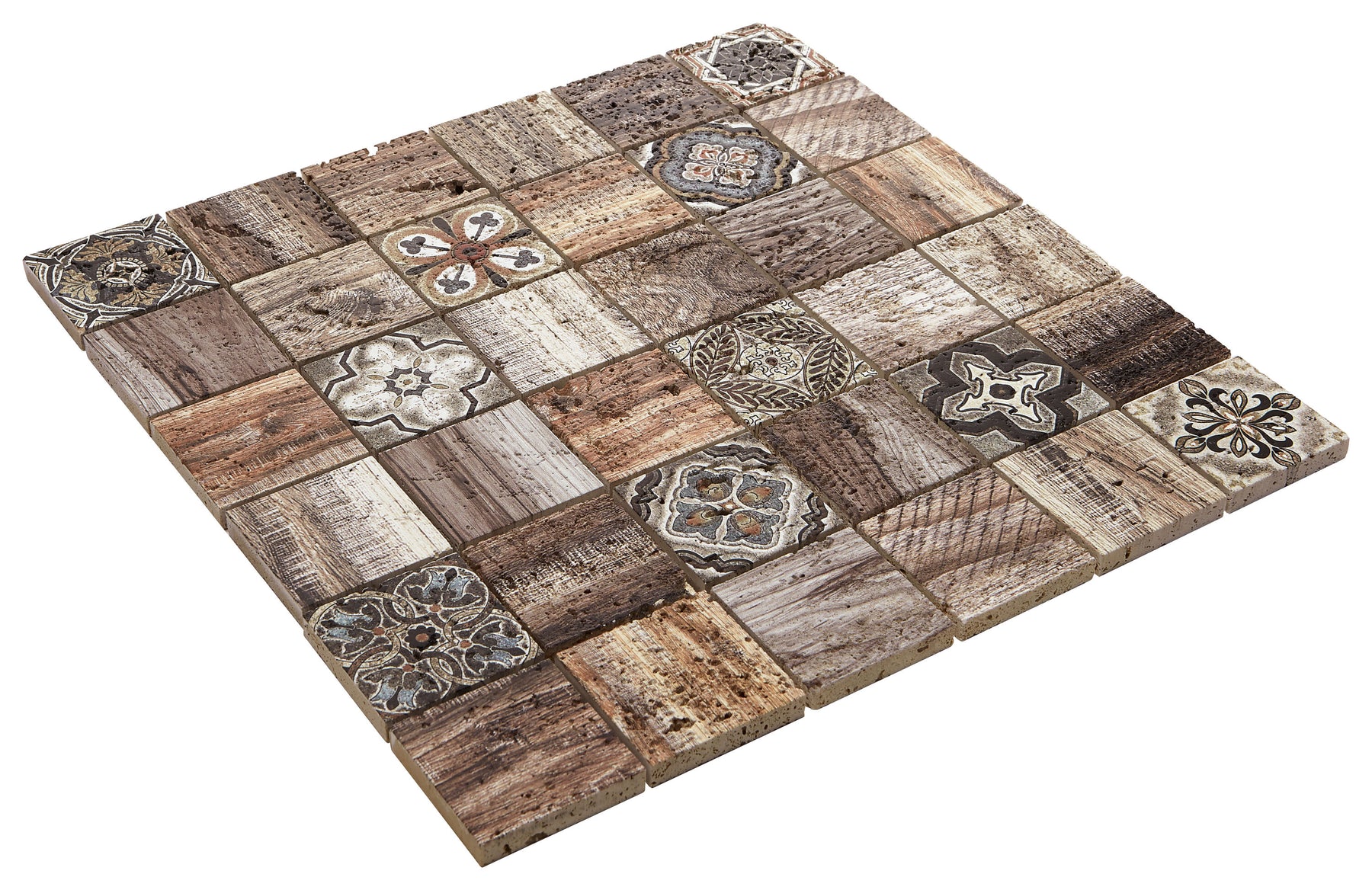 This mosaic breathes artisanal warmth into a room, blending Moroccan motifs with the tactile richness of natural travertine. The wood‑look accents add depth and texture, creating a layered, collected aesthetic. Style it as a full-height backsplash to frame stainless appliances or pair with matte black hardware for a refined contrast. It’s a quietly luxurious statement that elevates everyday living.