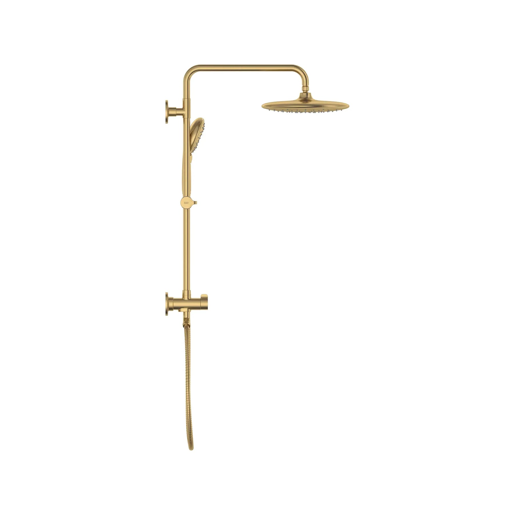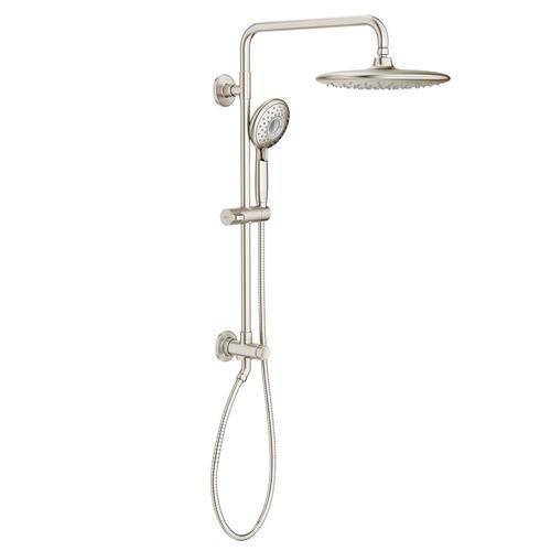 Spectra Versa brings an elegant vertical silhouette and a generous rain disc that instantly elevates the bath. The seamless bar and refined brushed nickel finish feel tailored and modern, while the hand shower’s four sprays add a touch of personalized ritual. Style it with soft neutrals and brushed accents to let the warm metallic glow sing. It’s a simple upgrade that delivers everyday luxury.