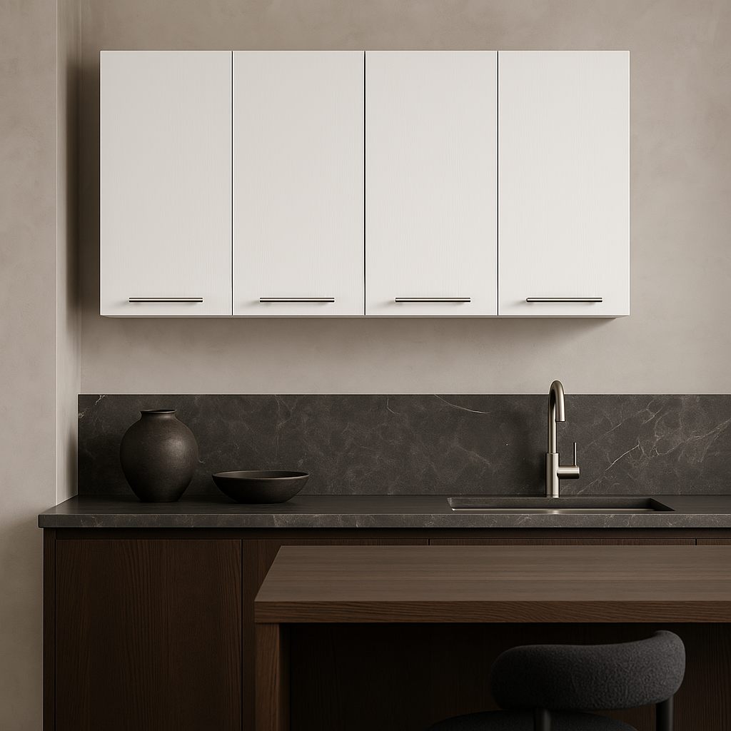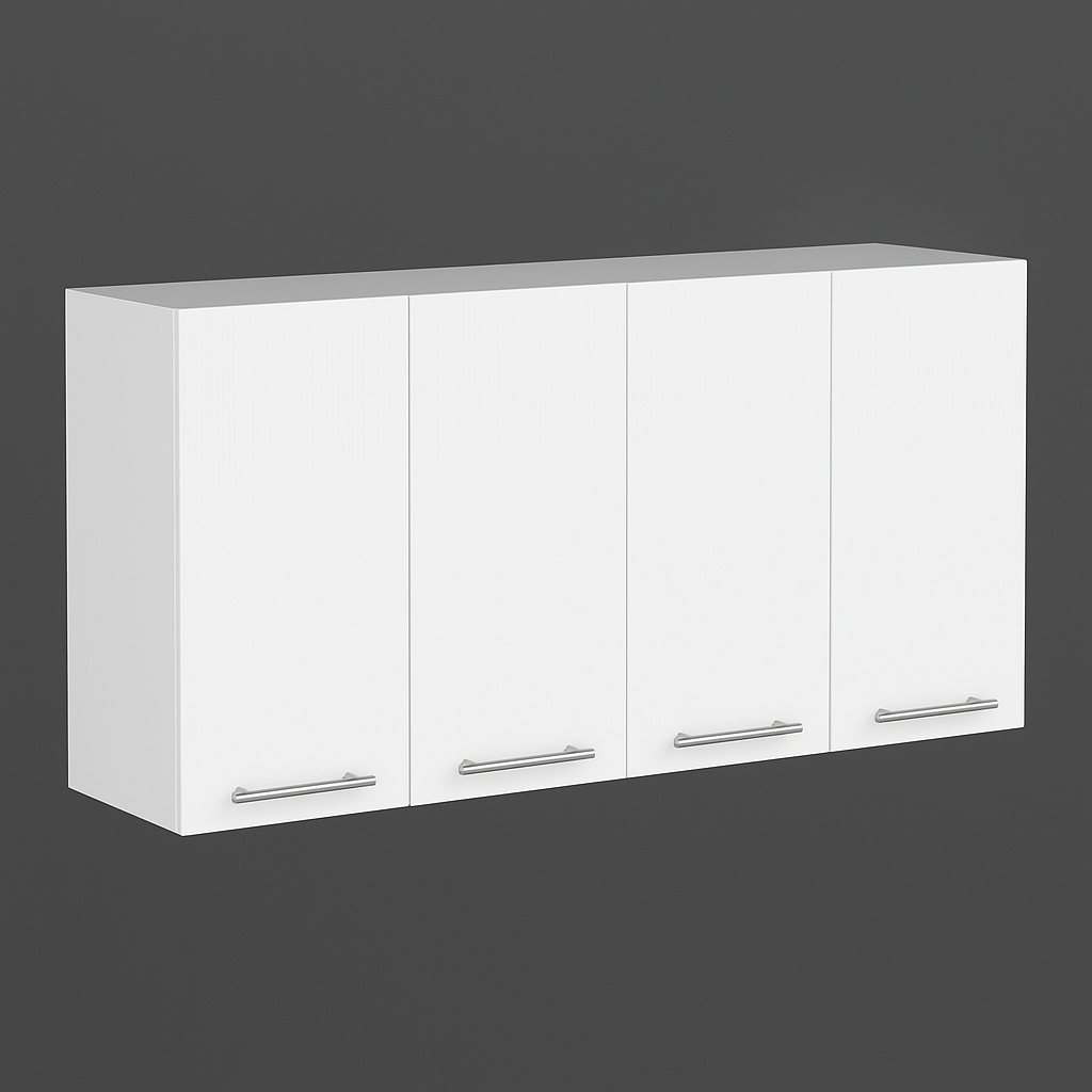 The Amucolo White Wall Kitchen Cabinet combines modern design with practical functionality, featuring spacious storage with four doors and split interior shelves for versatile organization.