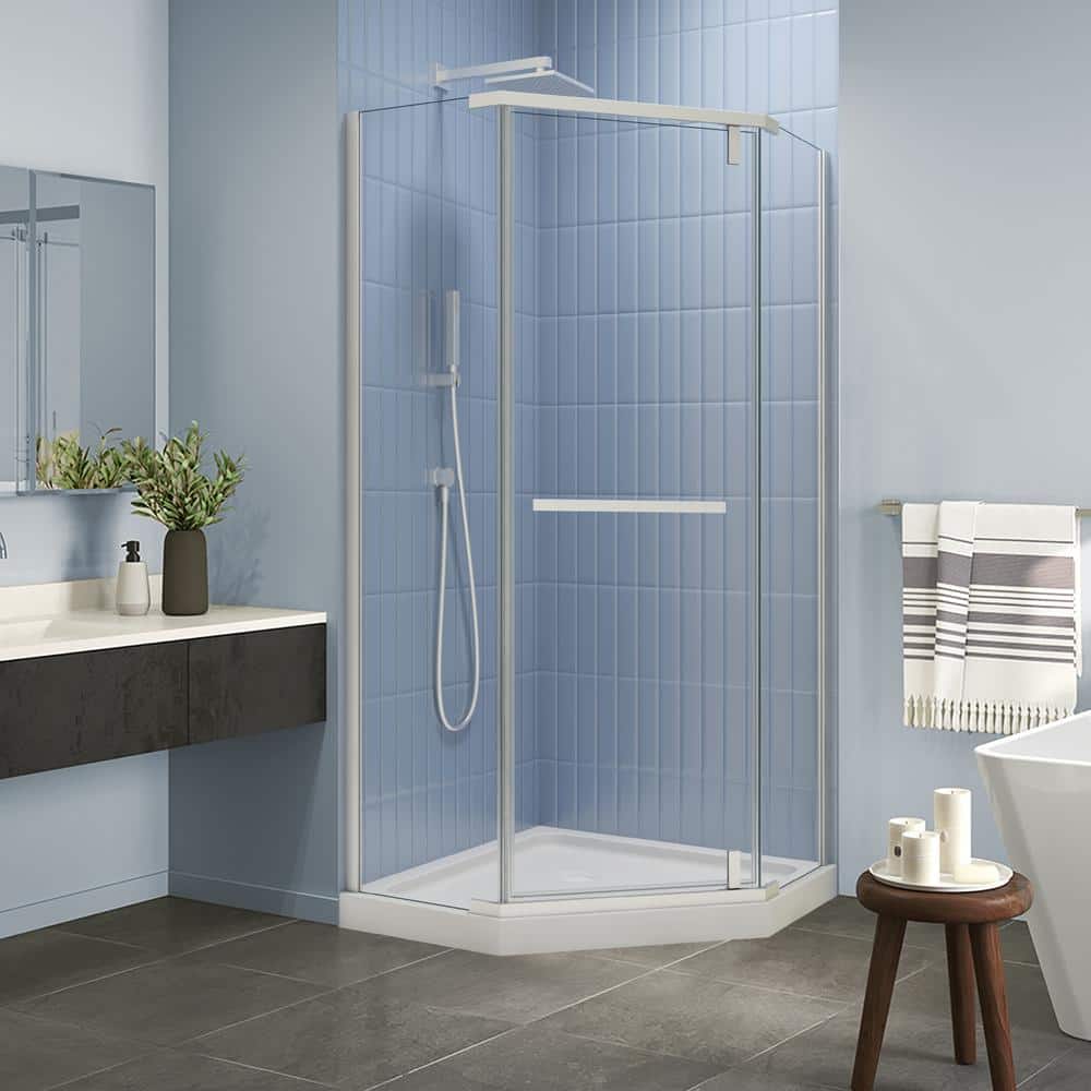 A: The shower door is designed for easy maintenance. Simply clean the glass with a glass cleaner and wipe the aluminum and stainless steel with a non-abrasive cleaner to maintain its shine.