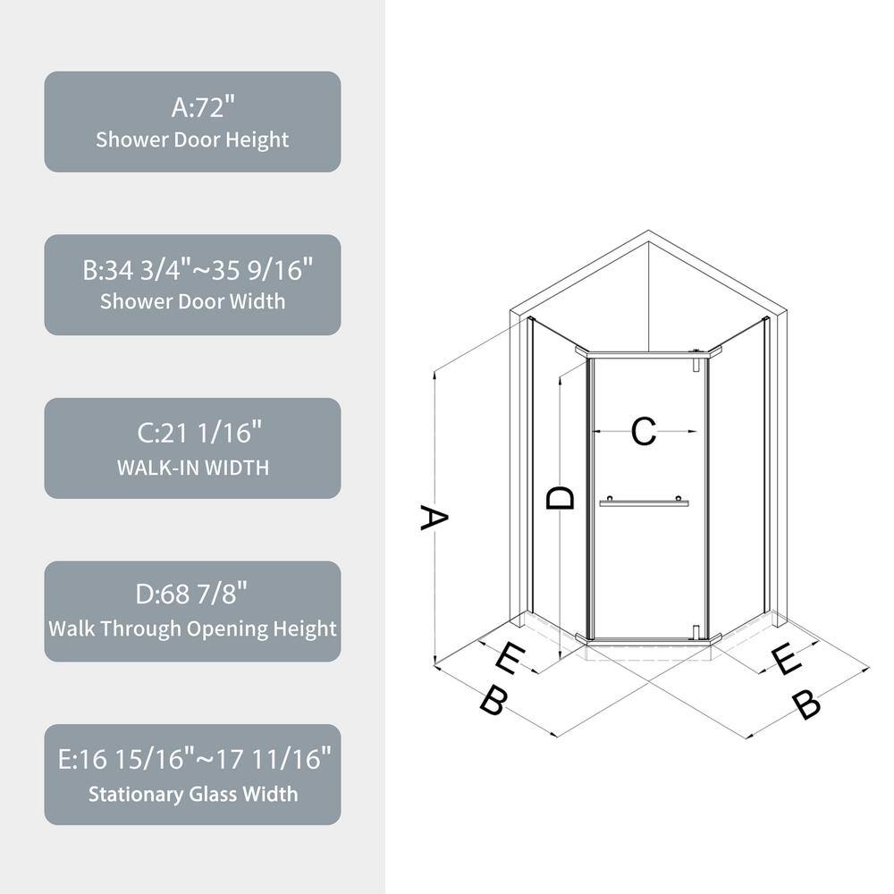 A: With dimensions of 34.75 in. W x 72 in. H, this door fits standard alcove installations and can be adapted for shower trays or floor setups.