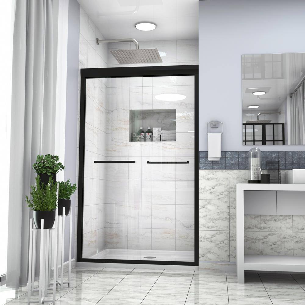 Elevate your bathroom's style and functionality with the ANGELES HOME Double Sliding Frameless Shower Door. Featuring a sleek matte black frame and clear certified glass, this elegant shower door enhances modern bathroom aesthetics while offering easy access and maintenance.