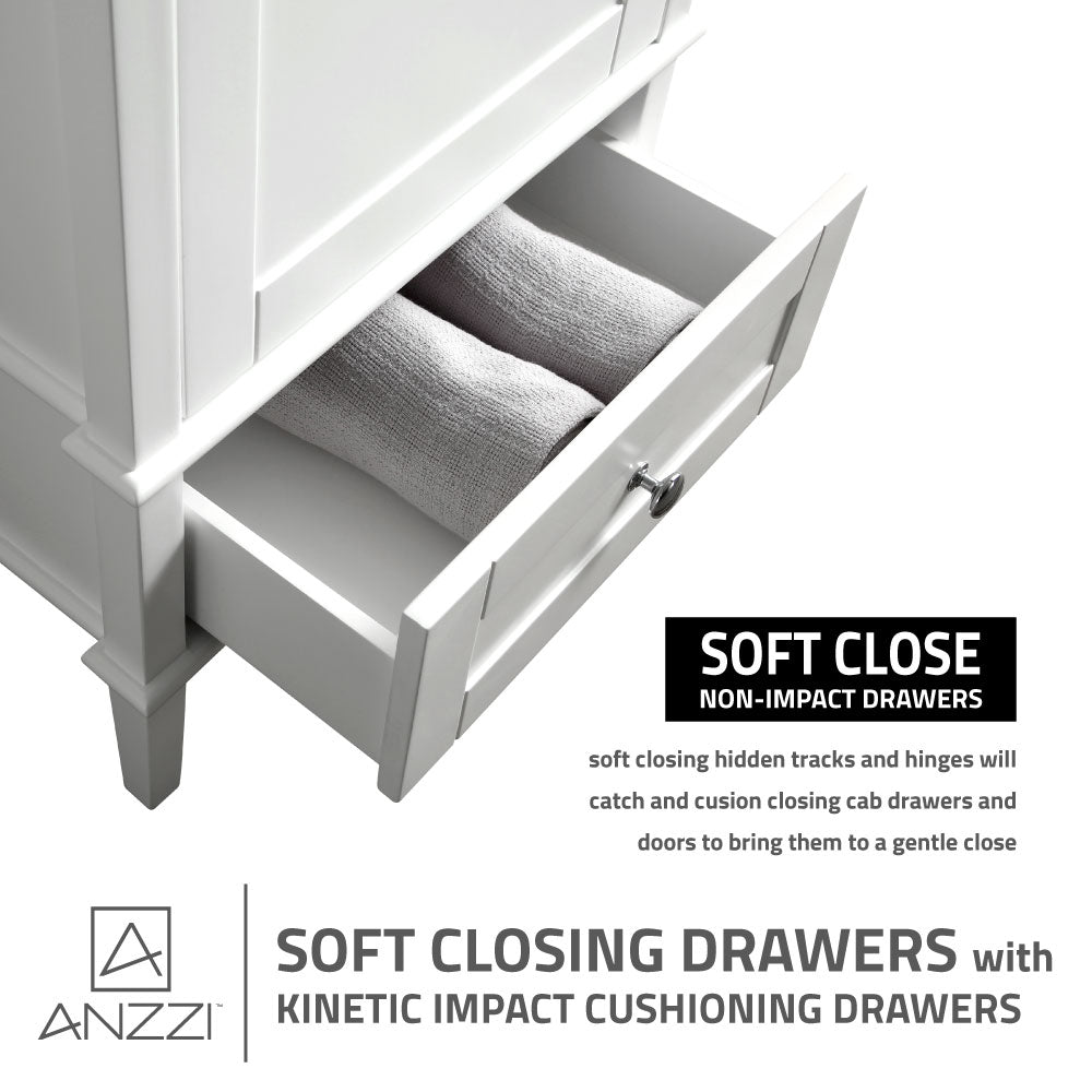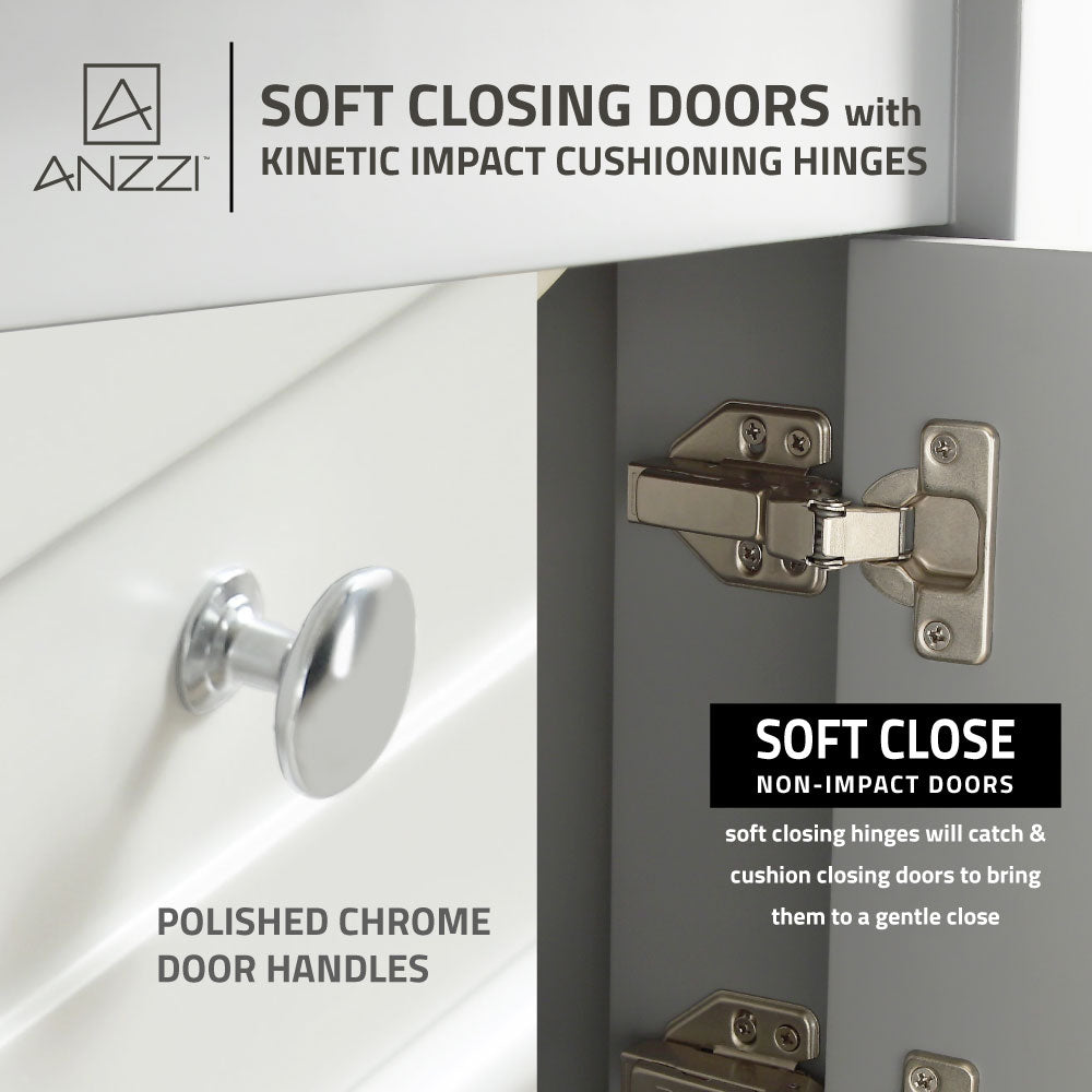 Compact yet refined, the ANZZI Alexander vanity combines a handmade wood cabinet with a pristine white man-made stone top and integrated sink. Soft-close door and drawer hardware with Paladin Protection finish deliver durability and quiet performance, while the matching wall-mounted mirror completes the set.
