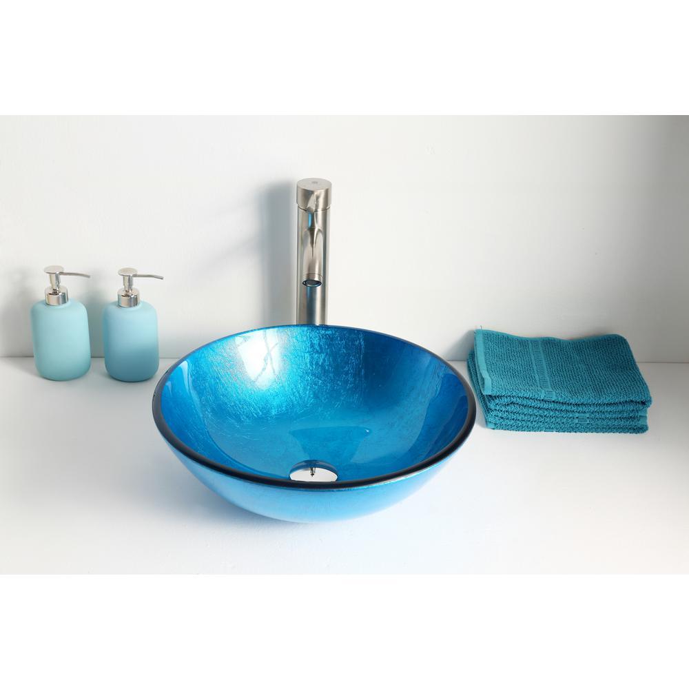 A round, tempered deco-glass vessel sink in a striking lustrous light blue finish. Built with RHINO ALLOY certified materials for durability and a scratch-tough, stain-resistant surface, it installs as a top-mount centerpiece for any bathroom.