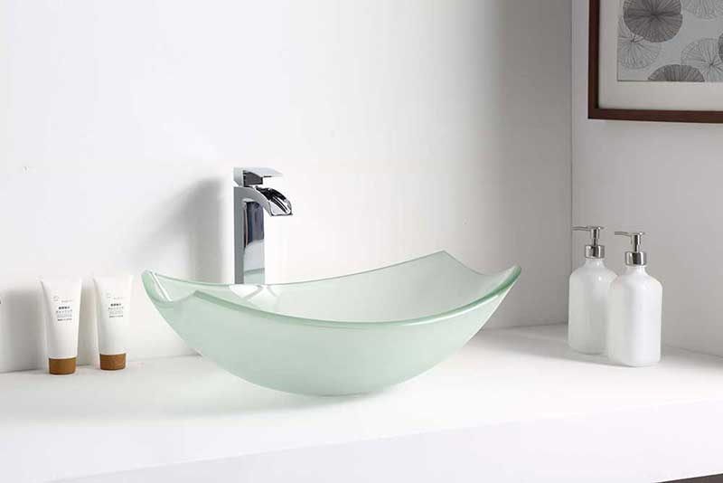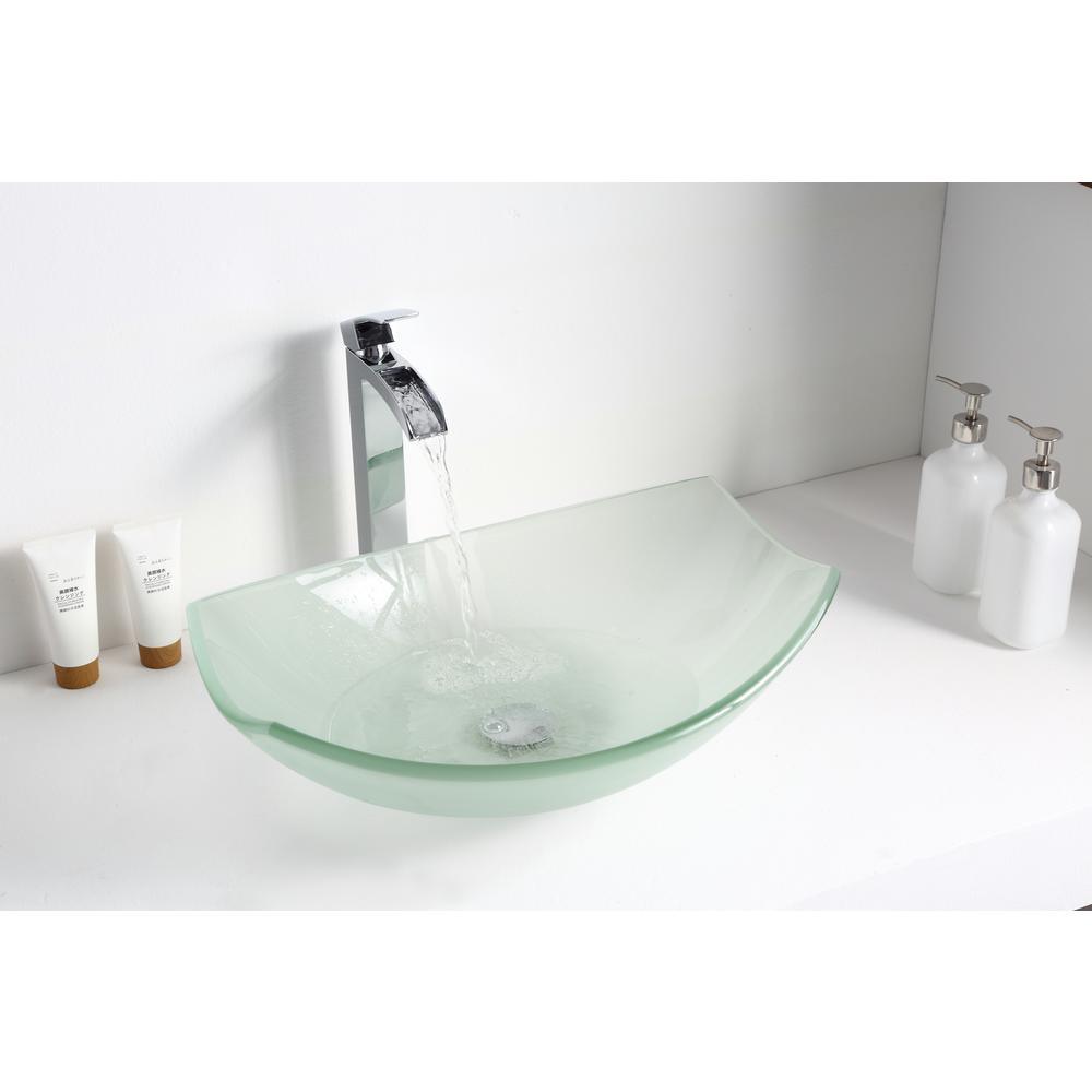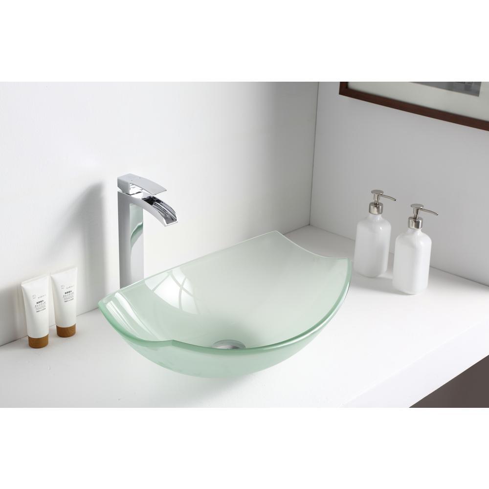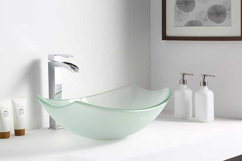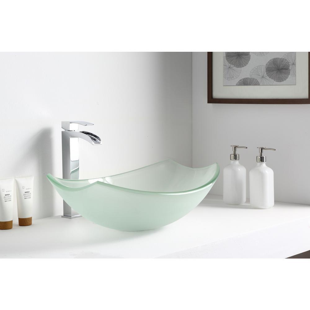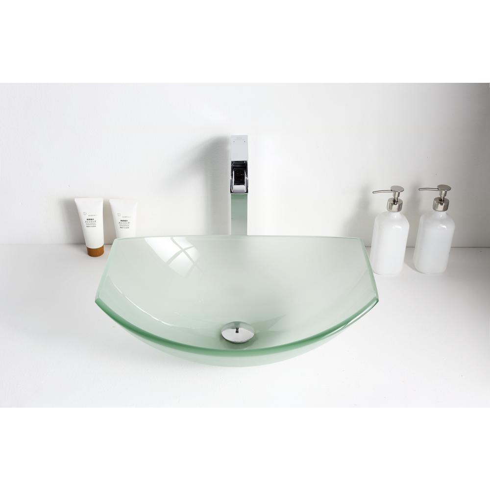 This vessel sink floats like a delicate sculpture, its lustrous frosted glass catching light with serene elegance. The softly curved oval form delivers a spa-like calm while remaining boldly modern. Pair it with a tall chrome faucet and crisp white surfaces to let the translucence sing. A refined essential that instantly elevates everyday rituals into luxury.