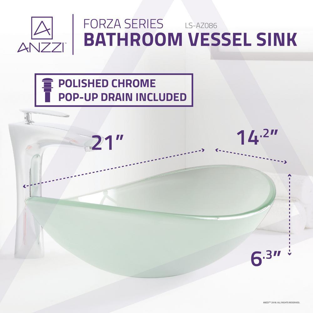 Sleek and modern, the ANZZI Forza vessel sink is crafted from RHINO ALLOY certified tempered deco-glass with a lustrous frosted finish. Its non-porous, stain- and scratch-resistant surface makes it easy to maintain, while the included chrome pop-up drain simplifies installation.