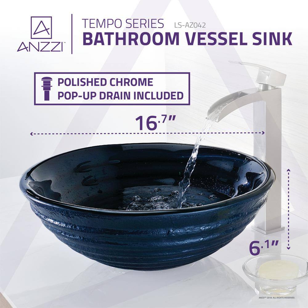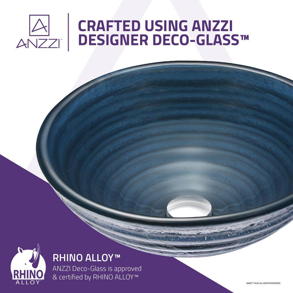 Elevate your bath with the ANZZI Tempo vessel sink, crafted from Rhino Alloy certified tempered deco-glass in a deep coiled blue finish. Its non-porous surface resists scratches and stains, and a polished chrome pop-up drain is included for easy top-mount installation.