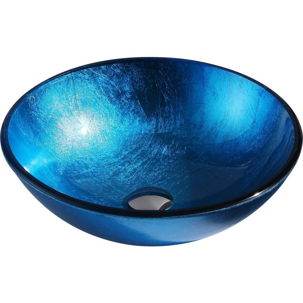 A round, lustrous light blue deco-glass vessel sink paired with an ANZZI vessel faucet delivers a striking centerpiece for any bathroom. Crafted from RHINO ALLOY certified tempered glass, it resists scratches and stains and installs easily as a top-mount sink.