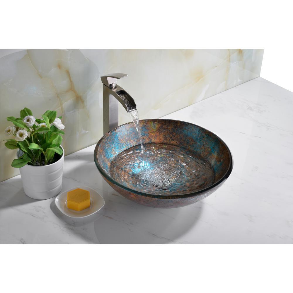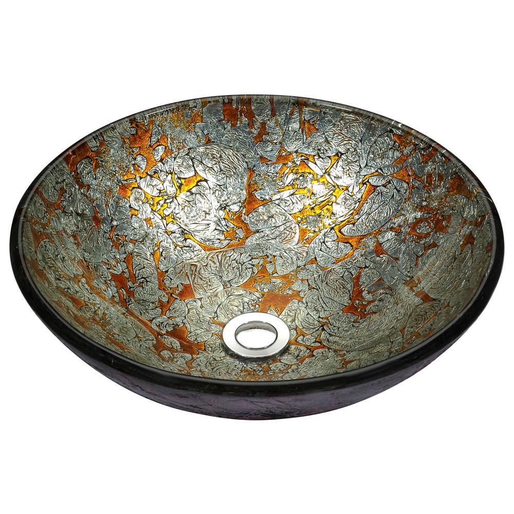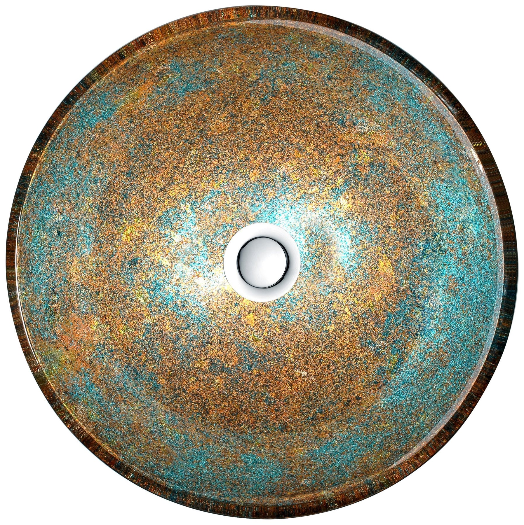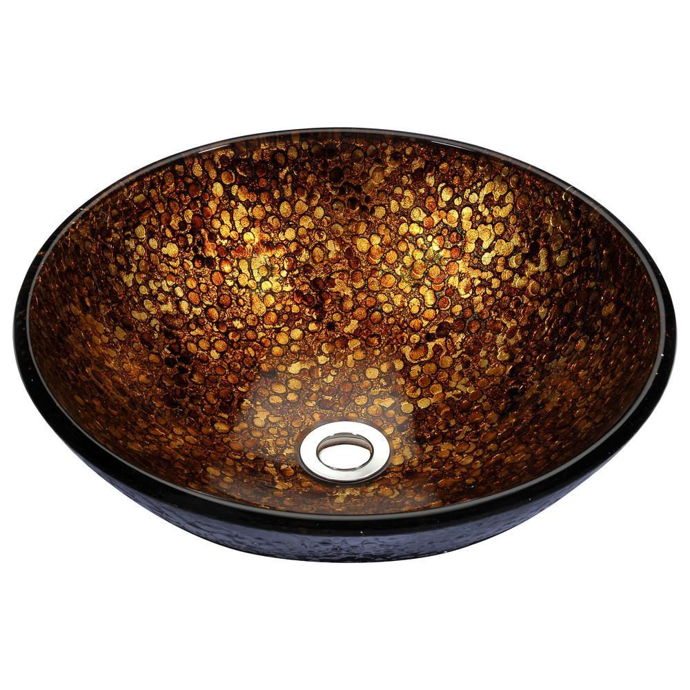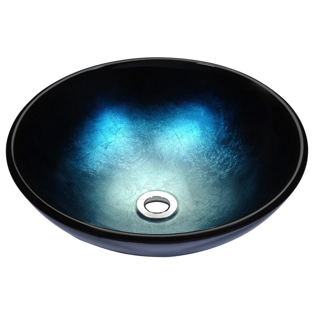 A round vessel sink from ANZZI’s Stellar Series, crafted from RHINO ALLOY certified tempered deco-glass with a striking Emerald Burst finish. Designed for top-mount installation, it offers a scratch-tough, stain-resistant, non-porous surface and includes a polished chrome pop-up drain.