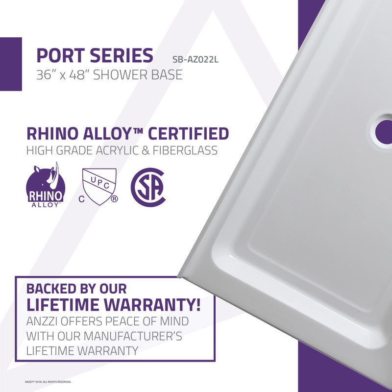Durable ANZZI Port shower base crafted from RHINO ALLOY marine-grade acrylic reinforced with fiberglass. Features a glossy white finish, integrated tile flange, and a slip-resistant textured floor with a center drain for reliable performance.