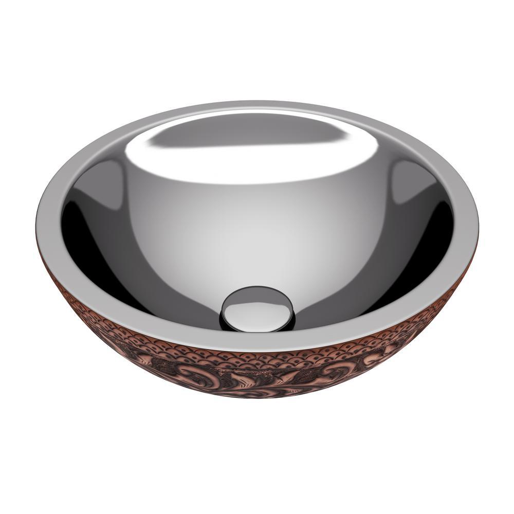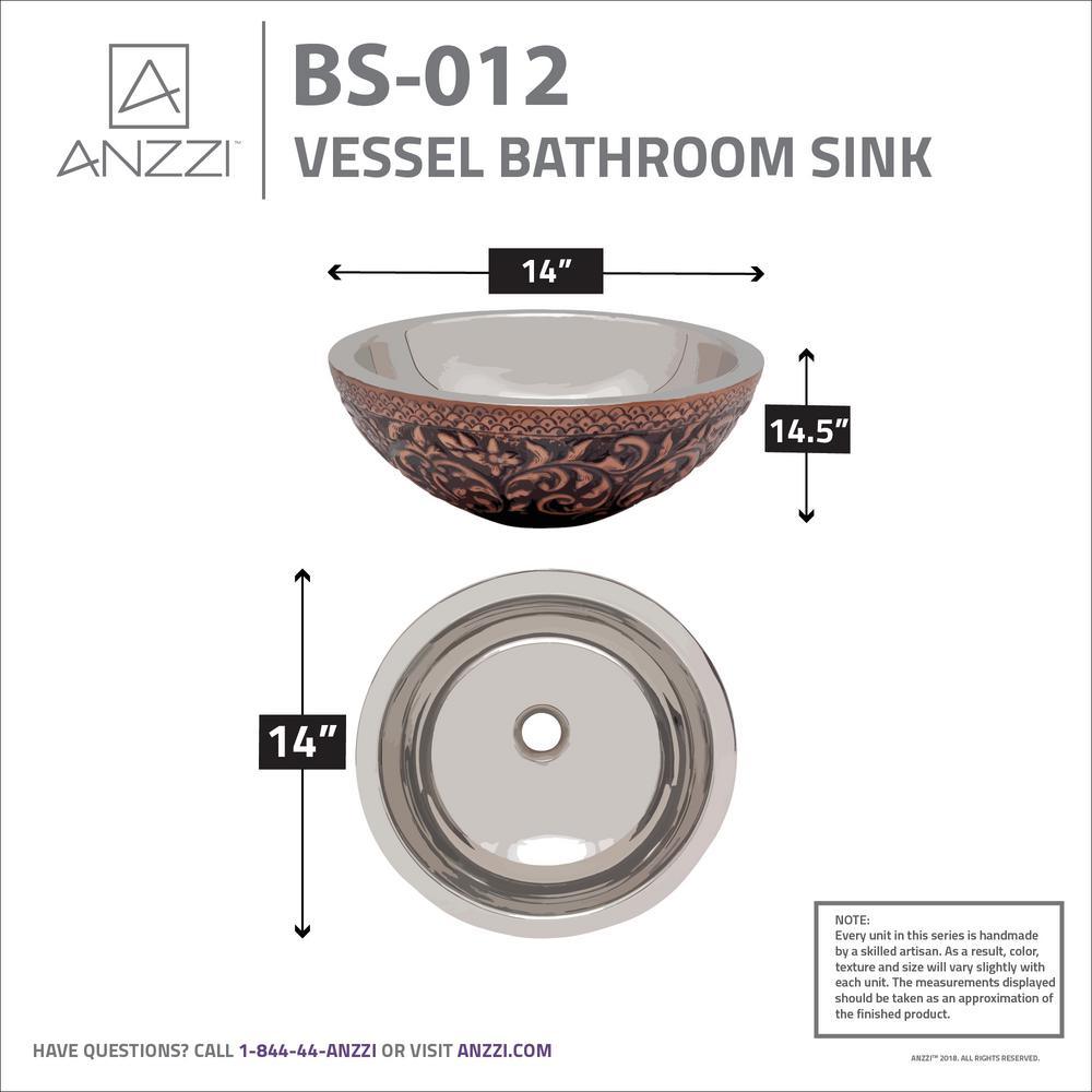 Handcrafted from Rhino Alloy certified copper, the ANZZI Crete vessel sink features a polished nickel interior and an antique copper exterior with an ornate floral pattern. Its artisanal, one-piece construction elevates bathroom vanities with a unique statement piece and enduring durability.