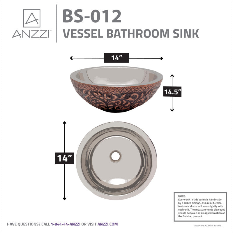 ANZZI Crete 14 in. Handmade Vessel Sink – Polished Antique Copper with Nickel Interior & Floral Exterior