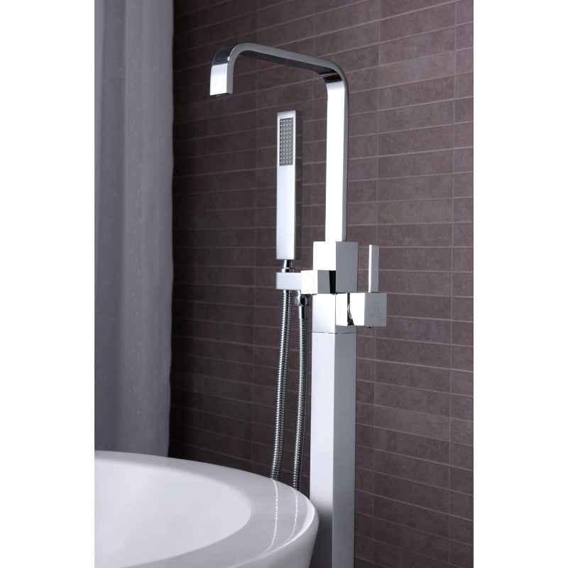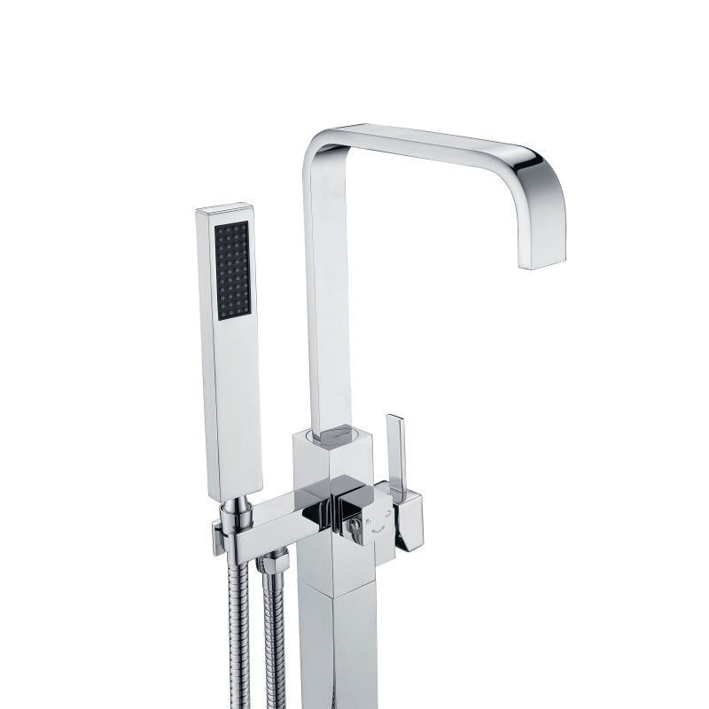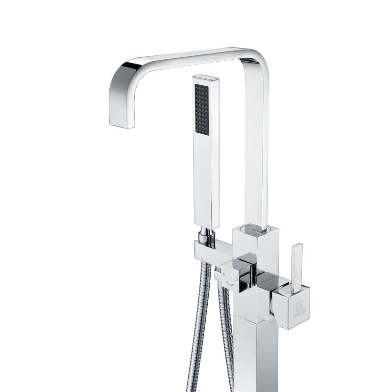 A modern freestanding bathtub faucet from ANZZI’s Victoria series, crafted from solid brass with Rhino Alloy components and a 2-handle control. Includes a handheld sprayer and built-in valves, delivering 1.8 gpm with floor-mounted installation.
