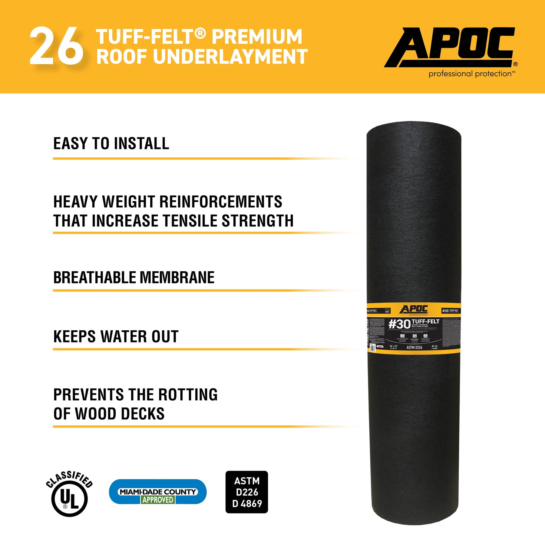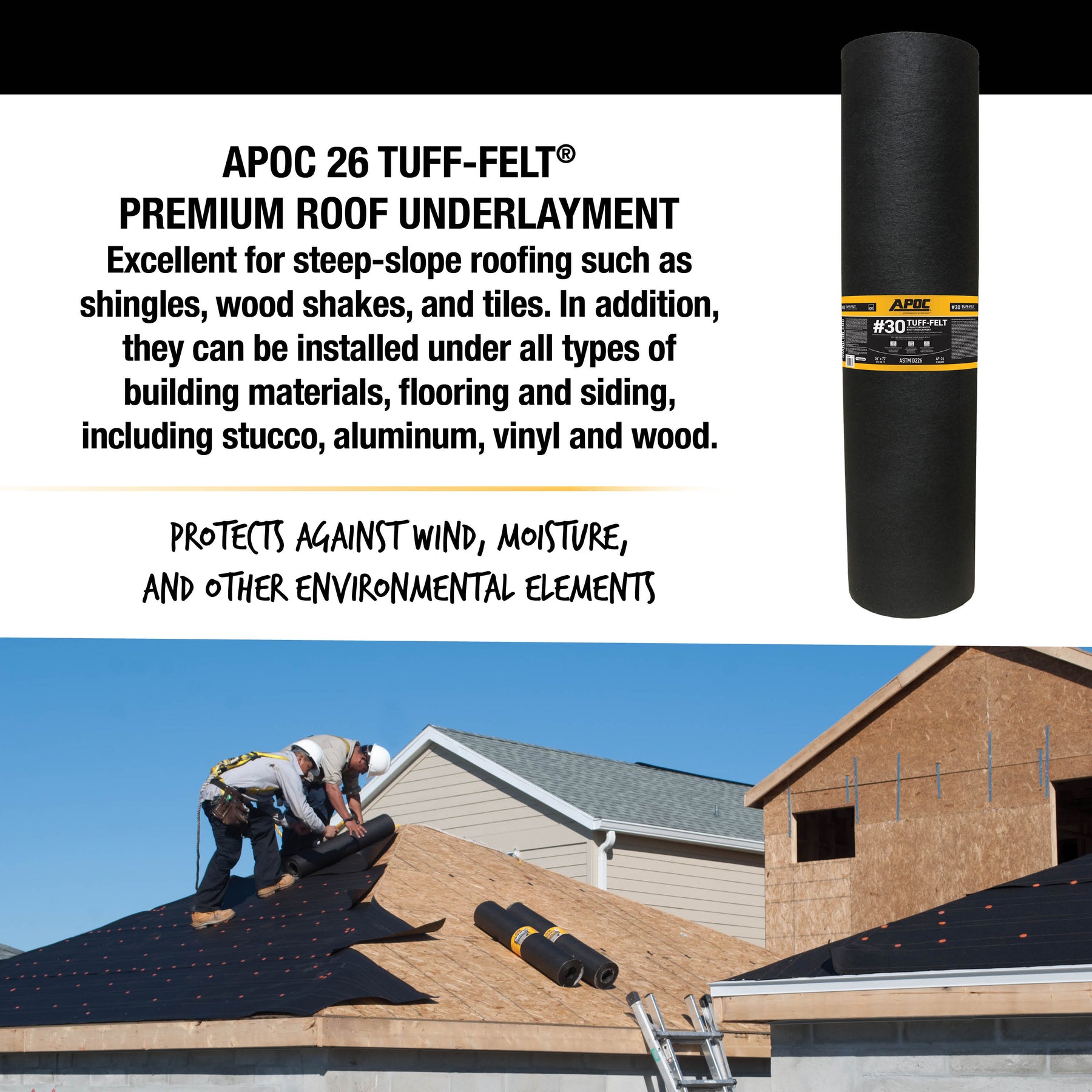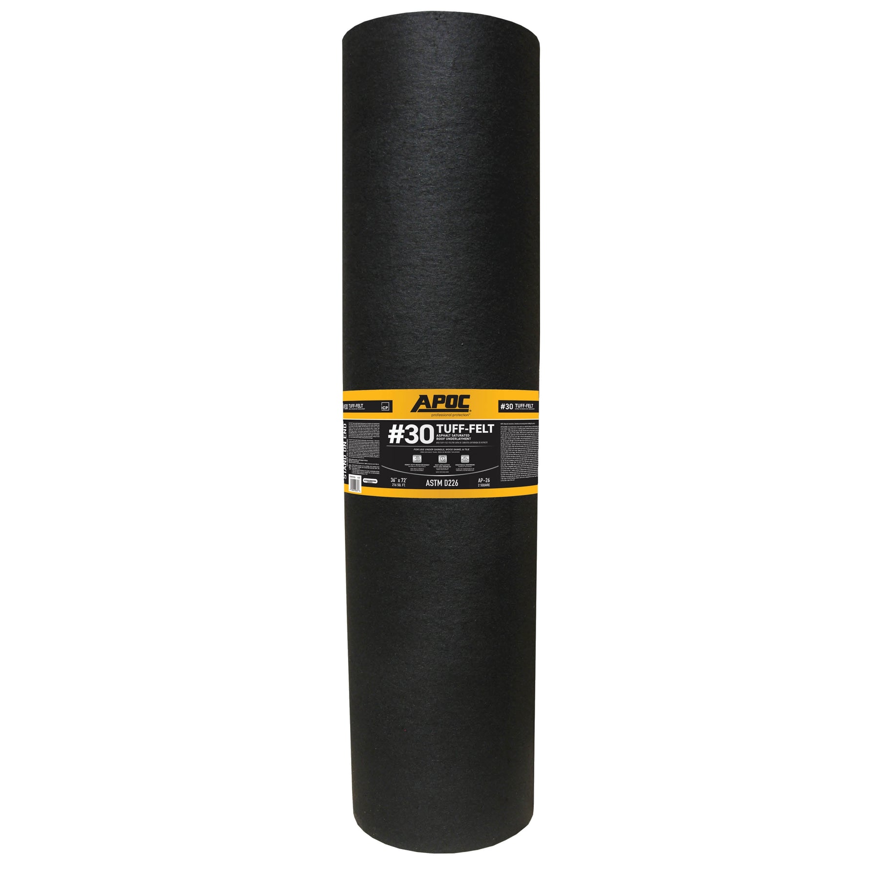 Heavy-duty APOC #30 Tuff-Felt roof underlayment delivers breathable, water-shedding protection for steep-slope roofs. The 36-in x 71.75-ft roll lays flat, resists wrinkling, and provides durable secondary weather protection under shingles or wood shakes.