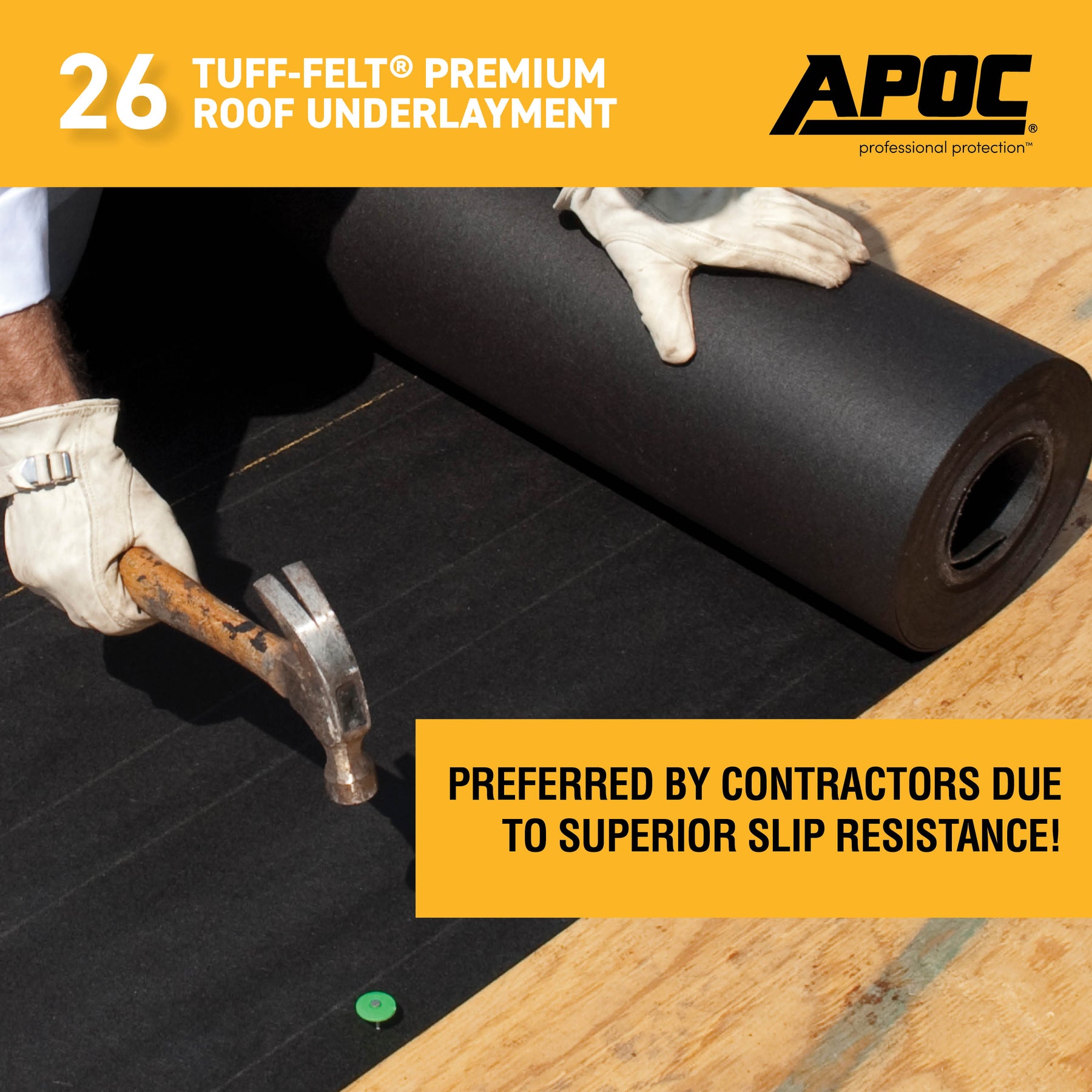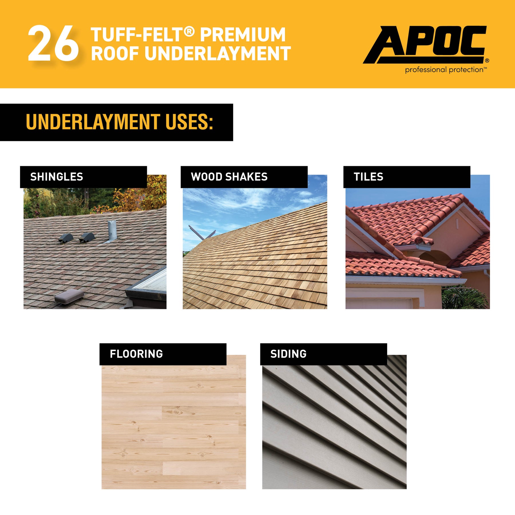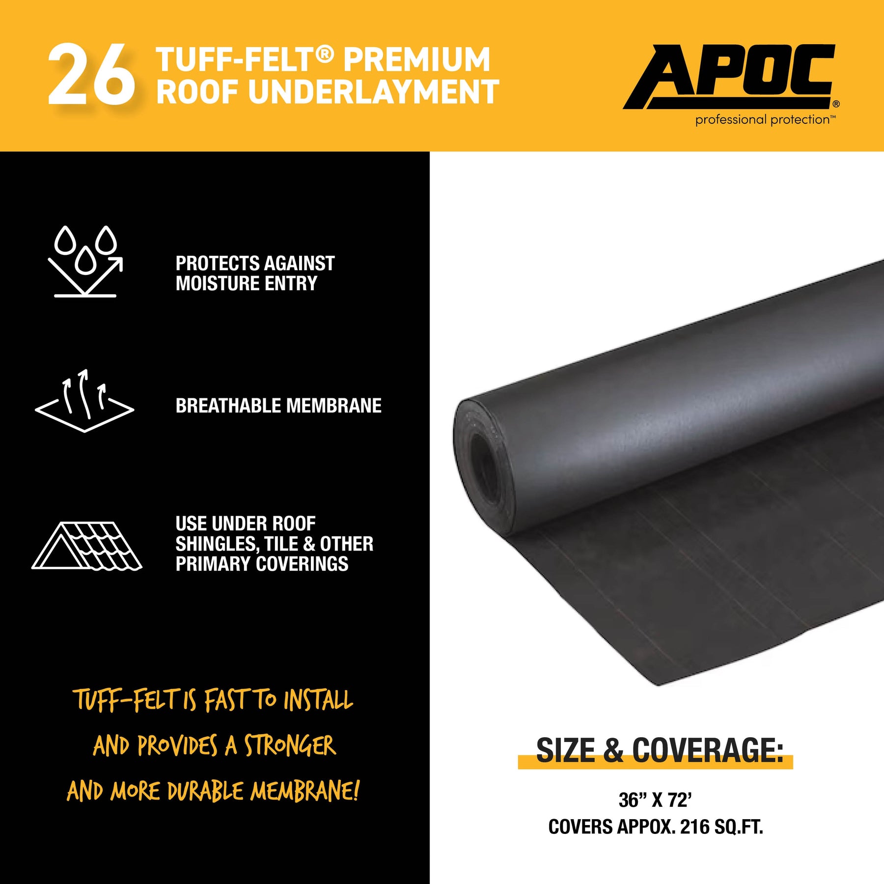 Heavy-duty APOC #30 Tuff-Felt roof underlayment delivers breathable, water-shedding protection for steep-slope roofs. The 36-in x 71.75-ft roll lays flat, resists wrinkling, and provides durable secondary weather protection under shingles or wood shakes.