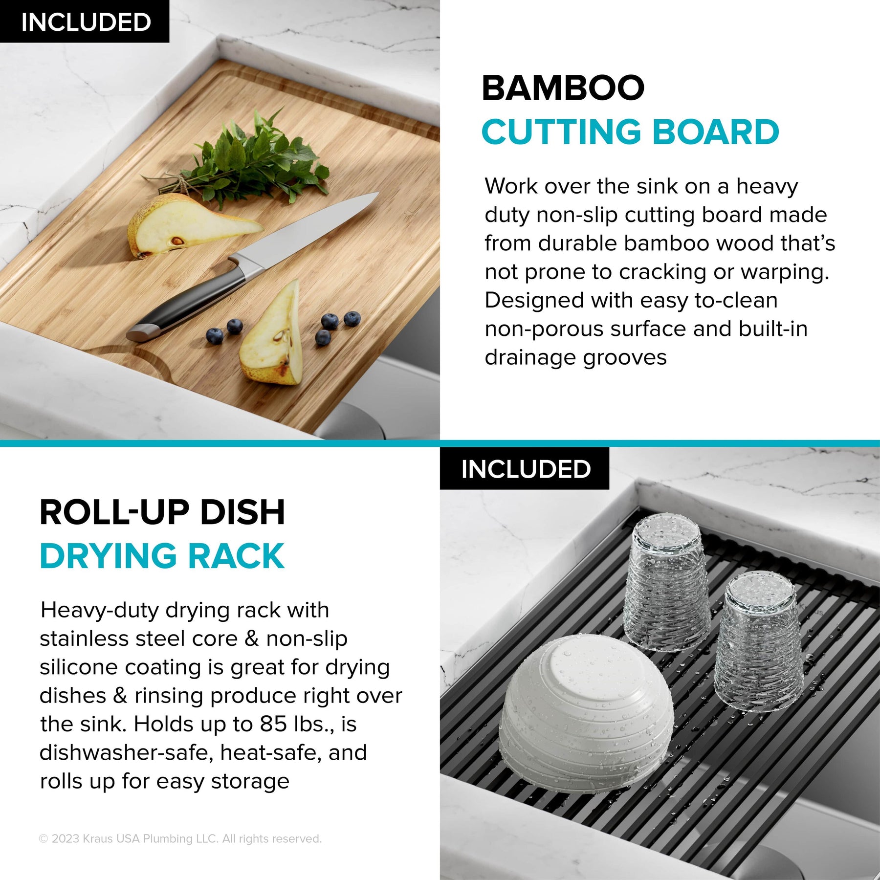 • Complete Kit Included: Bamboo cutting board, roll-up drying rack, bottom grid, drain assembly, and drain cover