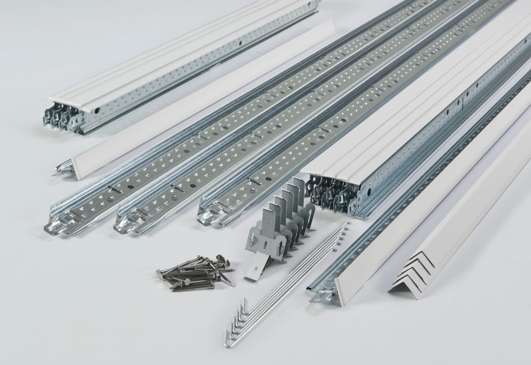 Includes Three 6-ft main beams; nine 4-ft cross tees; nine 2-ft cross tees; six 6-ft wall moldings; six 12-in QuickHang hooks; six joist brackets; forty nails