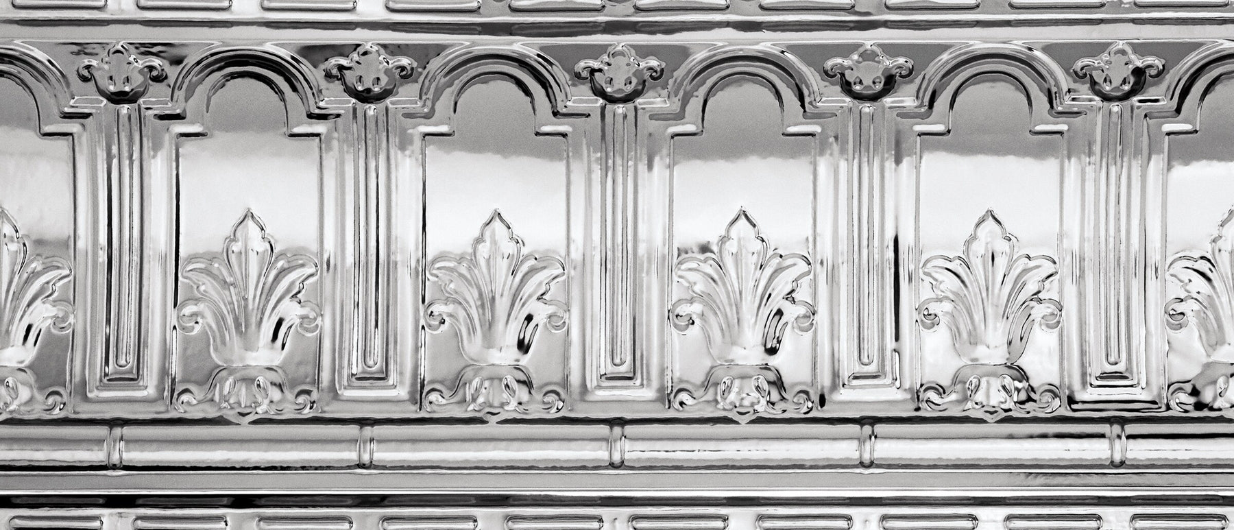 This chrome cornice frames the room with a polished, architectural flourish, echoing the grandeur of vintage tin ceilings. The trefoil motif catches light beautifully, giving vertical surfaces a sculptural rhythm. Pair it with mirrored accents or deep, moody wall colors to amplify the metallic sheen. It’s a luxe finishing touch that transforms everyday interiors into timeless, refined spaces.