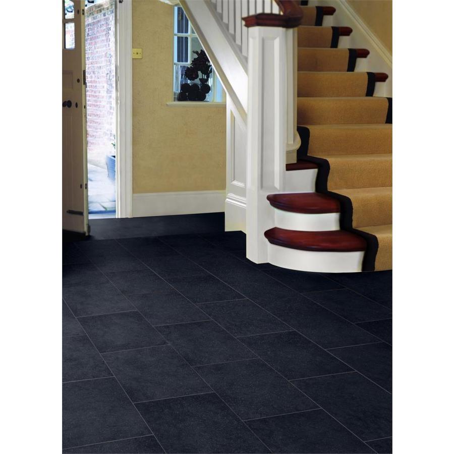 Product sample representative of actual flooring color and finish, showing flooring detail, construction and installation method as well as actual thickness of actual product Black porcelain pavers are staggered with contrasting grout to create a bold yet clean modern look The ultimate in scratch and stain protection, providing peace of mind, no matter what life throws at it with MasterShield Easy to clean with Once 'n Done floor cleaner from Armstrong Flooring Rip, tear, gouge and indent resistant Modified loose lay, releasable or permanent adhesion installation options 25-year Limited Residential Warranty Complies with the floor covering requirements set forth in the United States HUD Minimum Property Standards for Housing for light traffic areas Certified by FloorScore® to meet or exceed low-emission standards for better indoor air quality and a healthier home