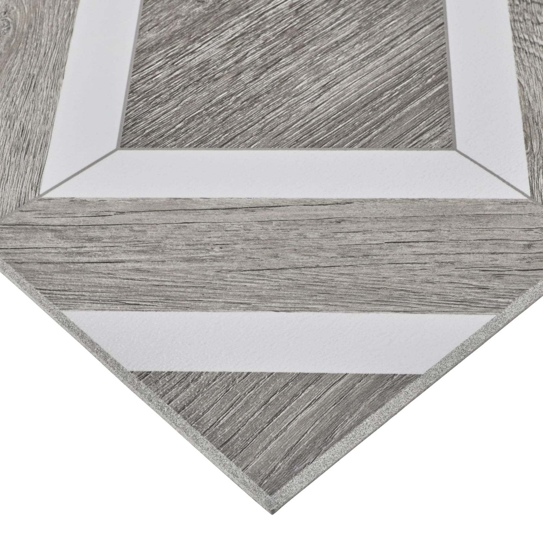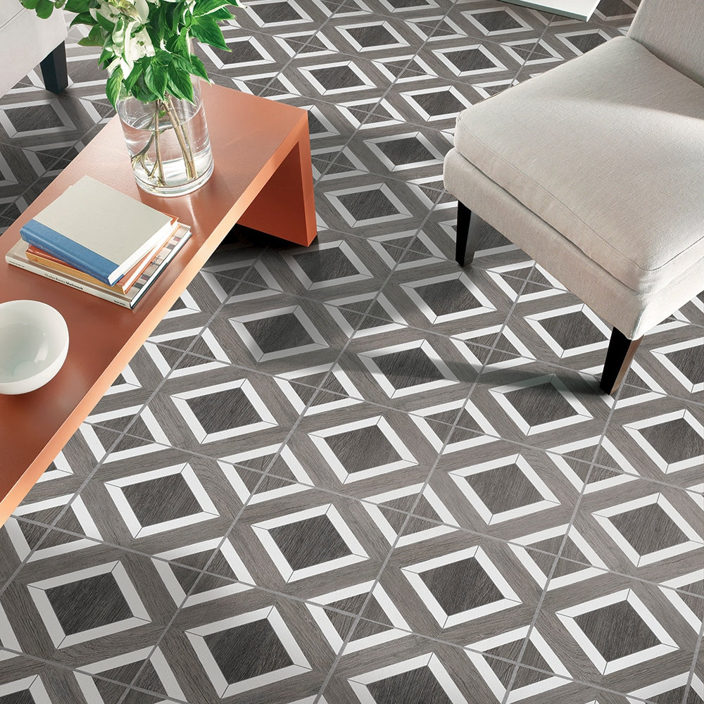 Terraza in Harbor Gray turns the floor into a captivating canvas—its diamond geometry and brushed wood tones bring sculptural movement to any room. The low-gloss finish softens the pattern, creating a refined balance between modern edge and timeless restraint. Pair it with burnished brass and inky cabinetry for contrast, or keep it airy with pale woods and linen. It’s the quick, polished foundation that makes everyday living feel luxuriously considered.