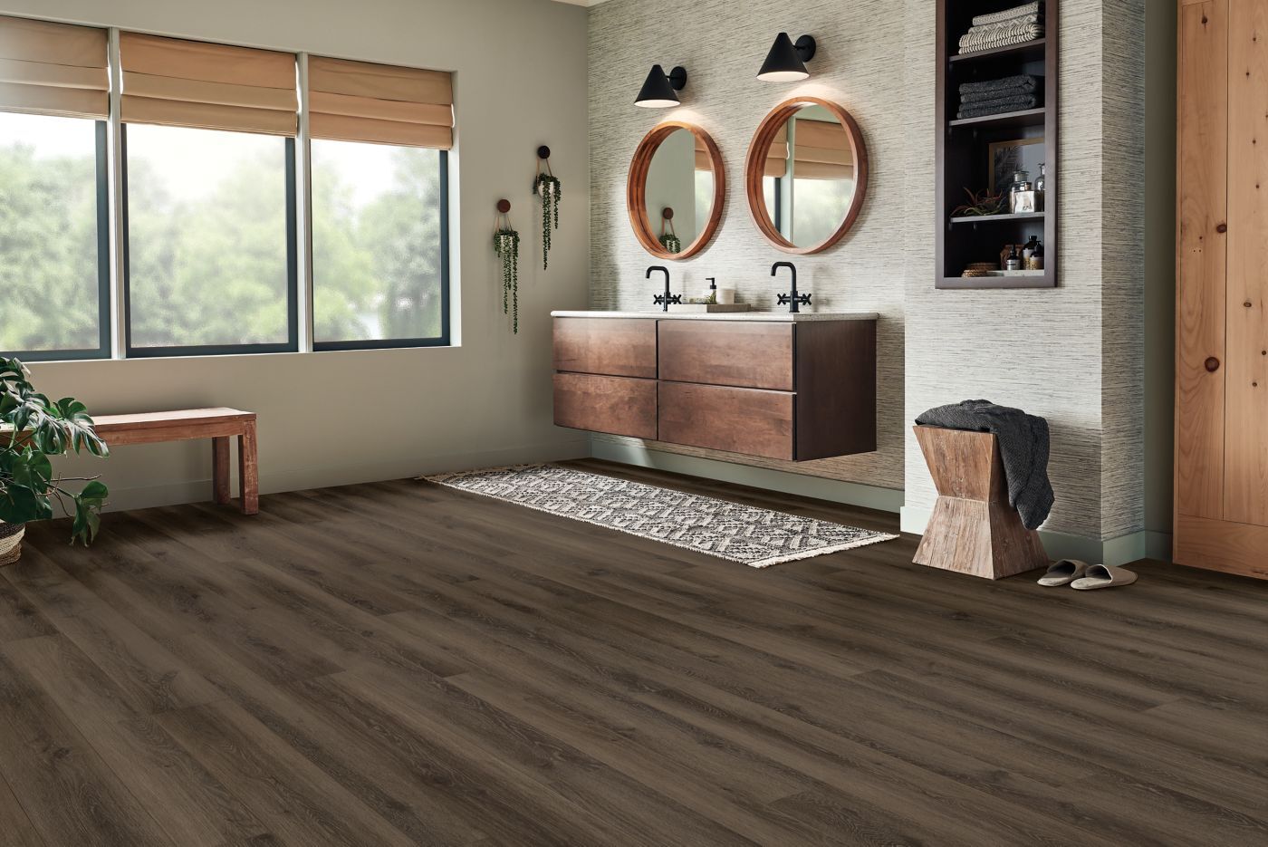 Reindeer Brown brings a rich, moody oak palette that instantly grounds a room with sophistication. The low‑gloss, textured surface and beveled edges feel authentic and tailored. Pair it with matte black fixtures and warm walnut cabinetry to create a layered, spa‑like retreat. Its reinforced core and Diamond 10 finish make it a chic essential for luxe, everyday living.