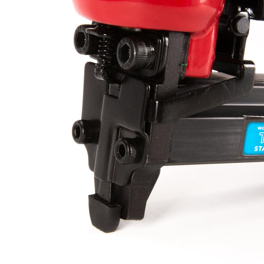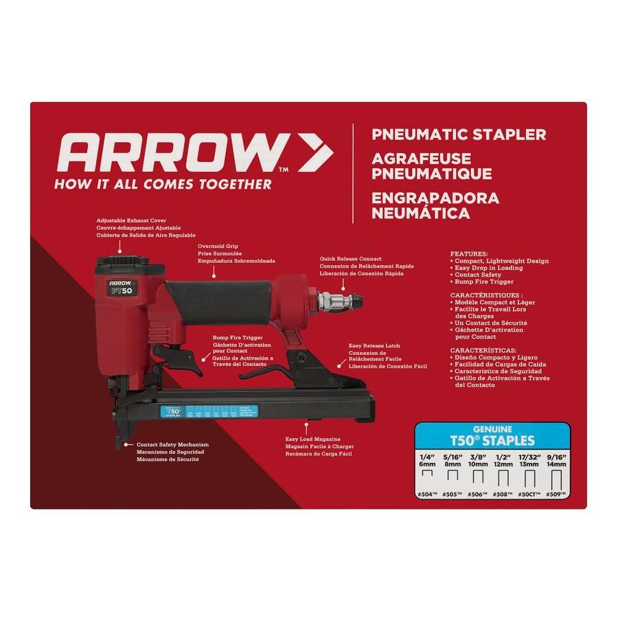 Compact, lightweight design Contact safety prevents accidental firing Works with T50 - 1/4, 5/16, 3/8, 1/2, 17/32, 9/16-in staples 3/8-In crown width Bump-fire trigger for fast firing Easy, drop-in loading for quick reload Includes 2 hex wrenches and replacement oil Perfect for heavy duty projects or construction jobs such as roofing, carpet and flooring installation and furniture manufacturing Other uses include installing baseboard, crown molding and floor trim