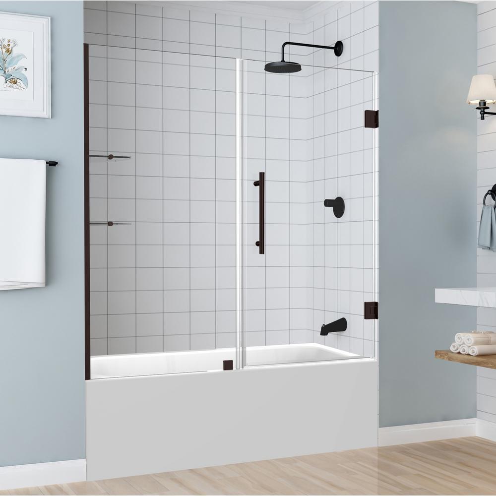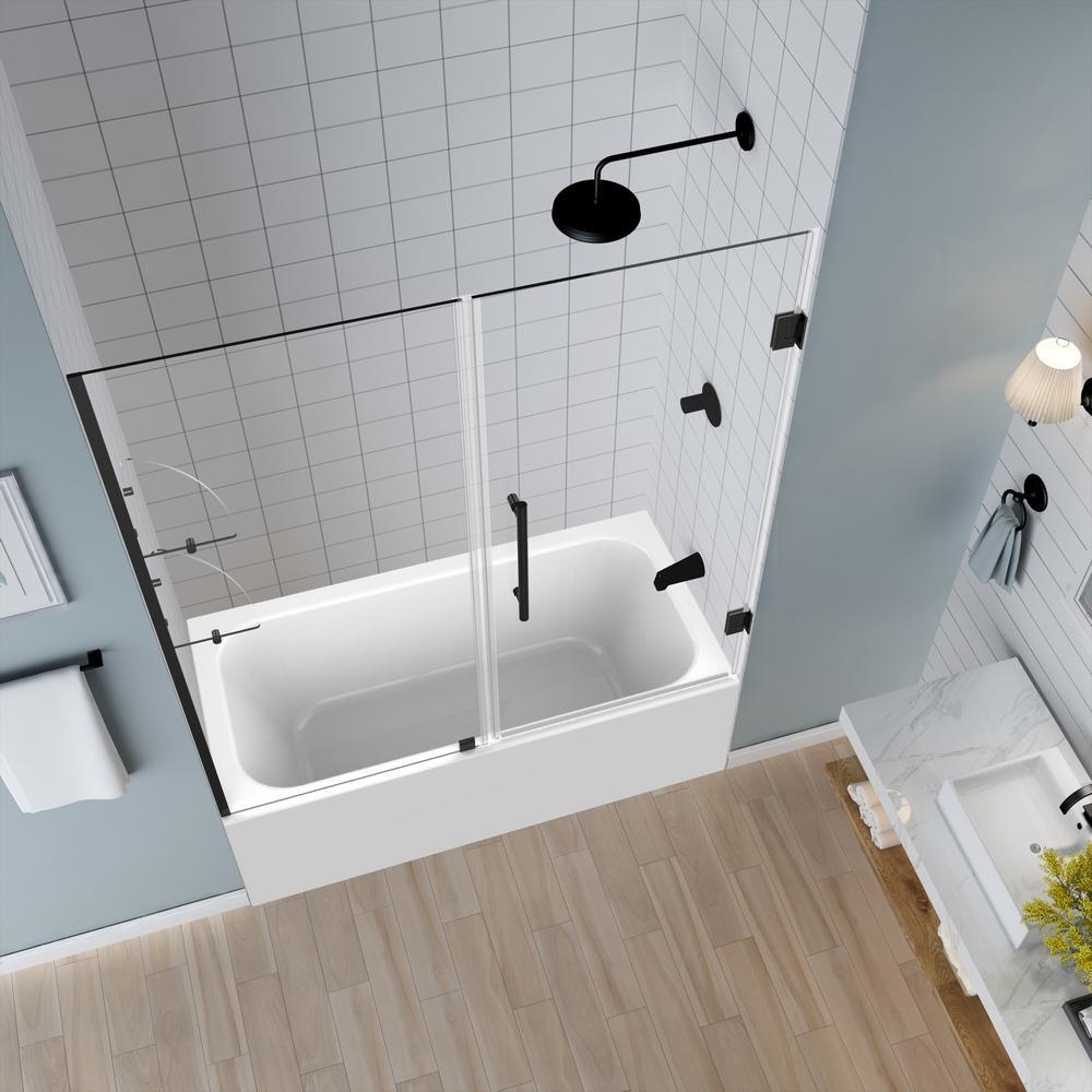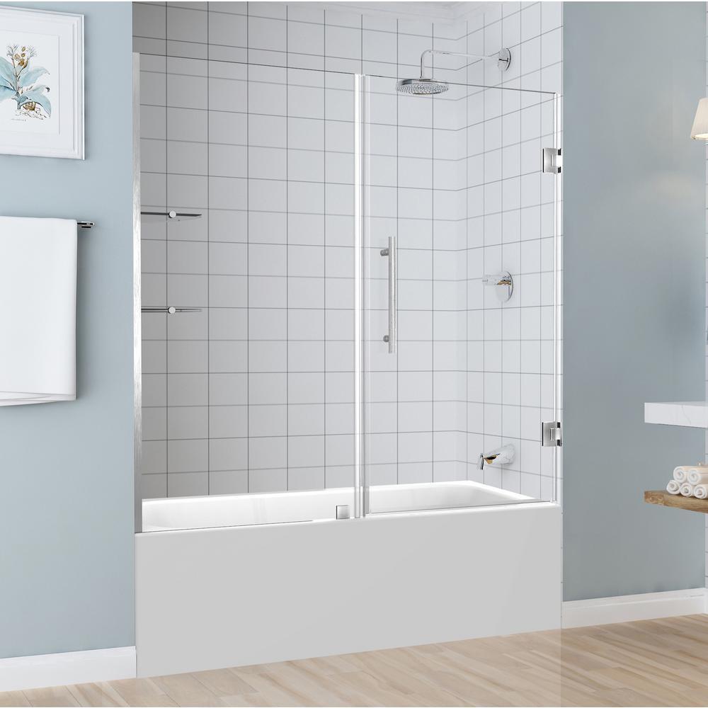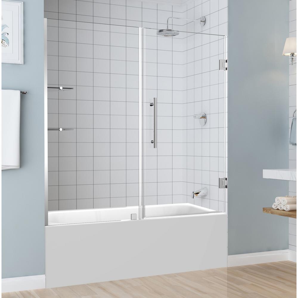 • 59.25 in. to 60.25 in. W x 60 in. H frameless hinged tub door with glass shelves