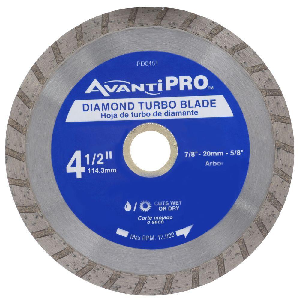 The AvantiPRO 4.5 in. Turbo Diamond Blade provides the best cutting performance and long life for all of your DIY projects. Use the turbo rim blade for fast and smooth cuts on concrete, brick, block, stone, and stucco. This blade will fit most small angle grinders.