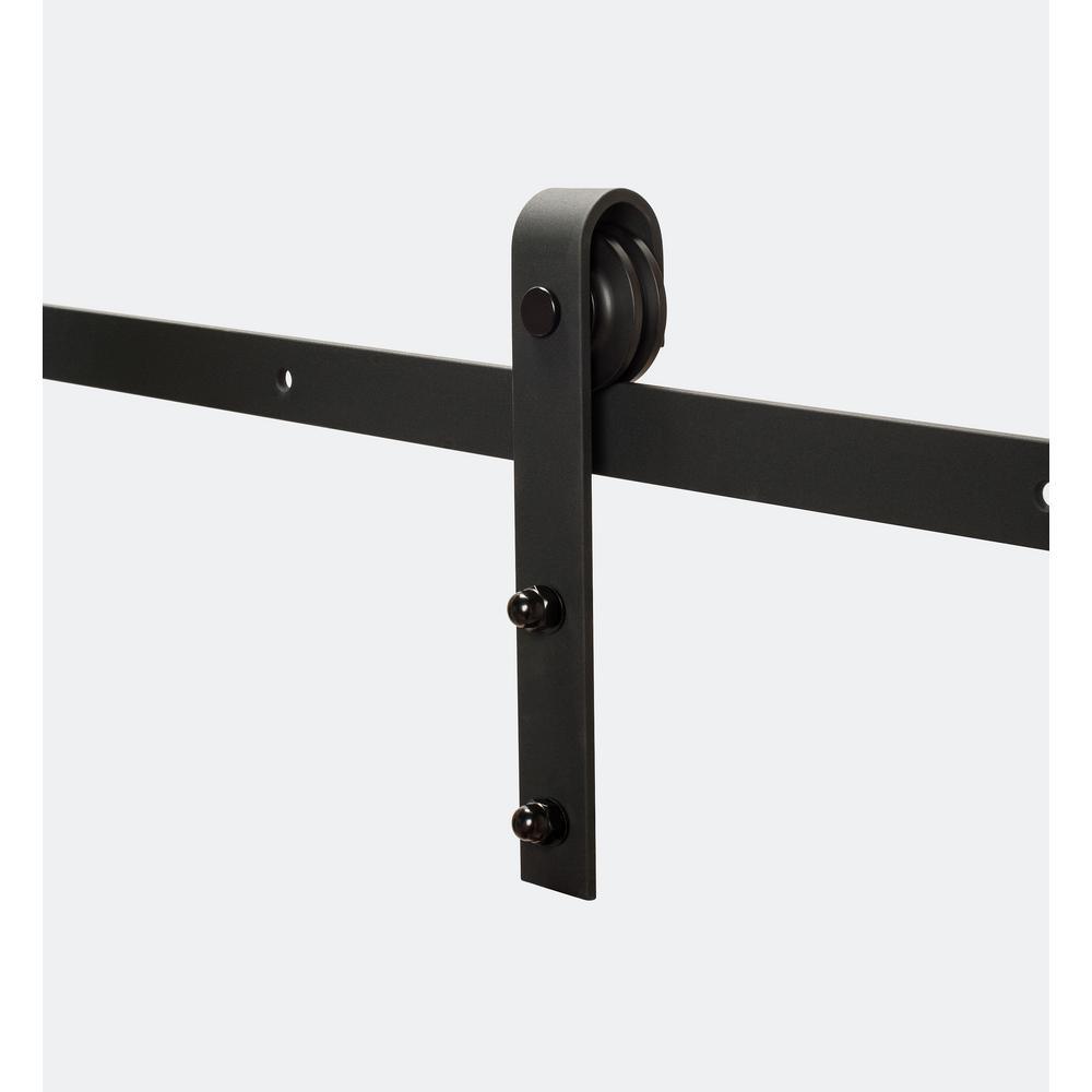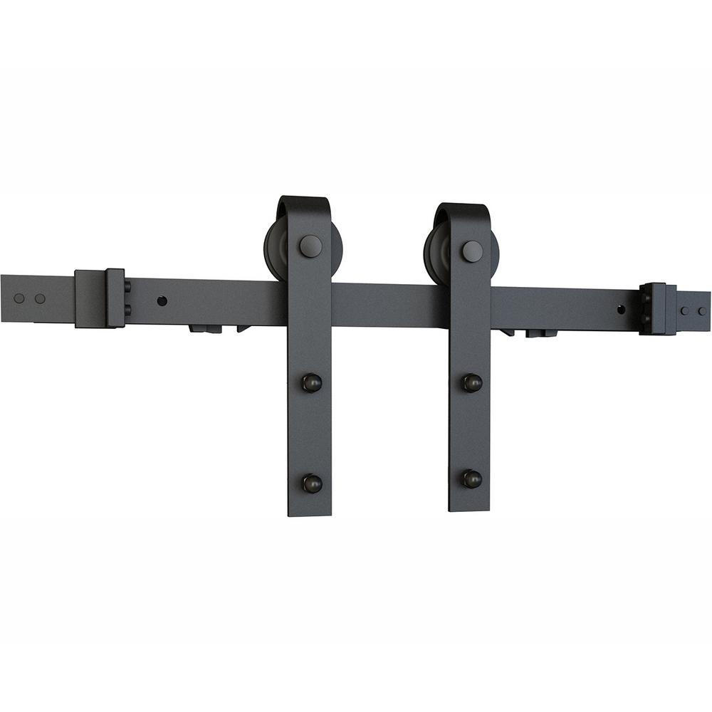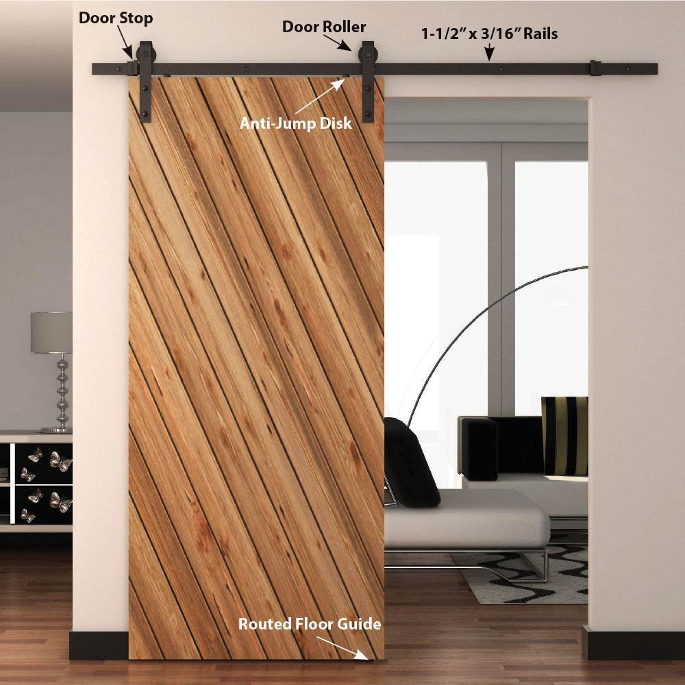 • Kit includes: 1 flat rail (78 in. x 1-1/2 in. x 3/16 in.), 2 door rollers, 2 door stops, 1 floor guide (to be routed into bottom of door), 5 wall brackets, 2 anti-jump disks and screws