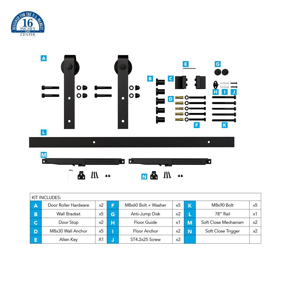 78 in. Soft Close Black Solid Steel Sliding Rolling Barn Door Hardware Kit for Single Wood Doors