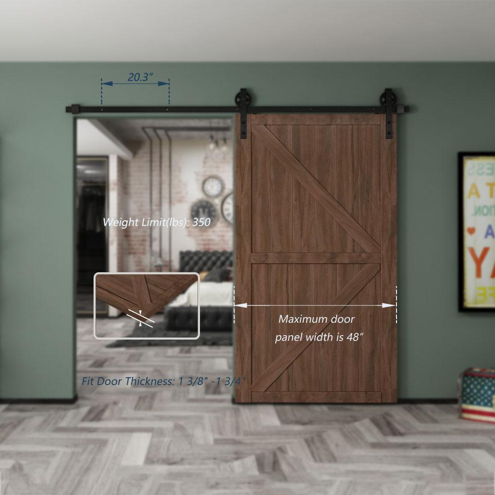• Pre-install notice: only the hardware is for sale, doors are not included the hardware package has lag bolts for wooden wall/drywall/concrete wall our sliding barn door hardware kit is compatible with door thickness from 1-3/8 in. to 1-3/4 in. if you have a door trim, you would better put a header board that is as thick as the trim and then attach the rail to the header board you need to have at least 8 in. of space between the top of the door to the ceiling to accommodate the hardware we use 2 hangers to hold 1 door, for a single door kit, there will be 2 hangers in the package, for a double door kit, there will be 4 hangers, if you have a door that is either too wide or too heavy, then you can purchase additional hangers for that door