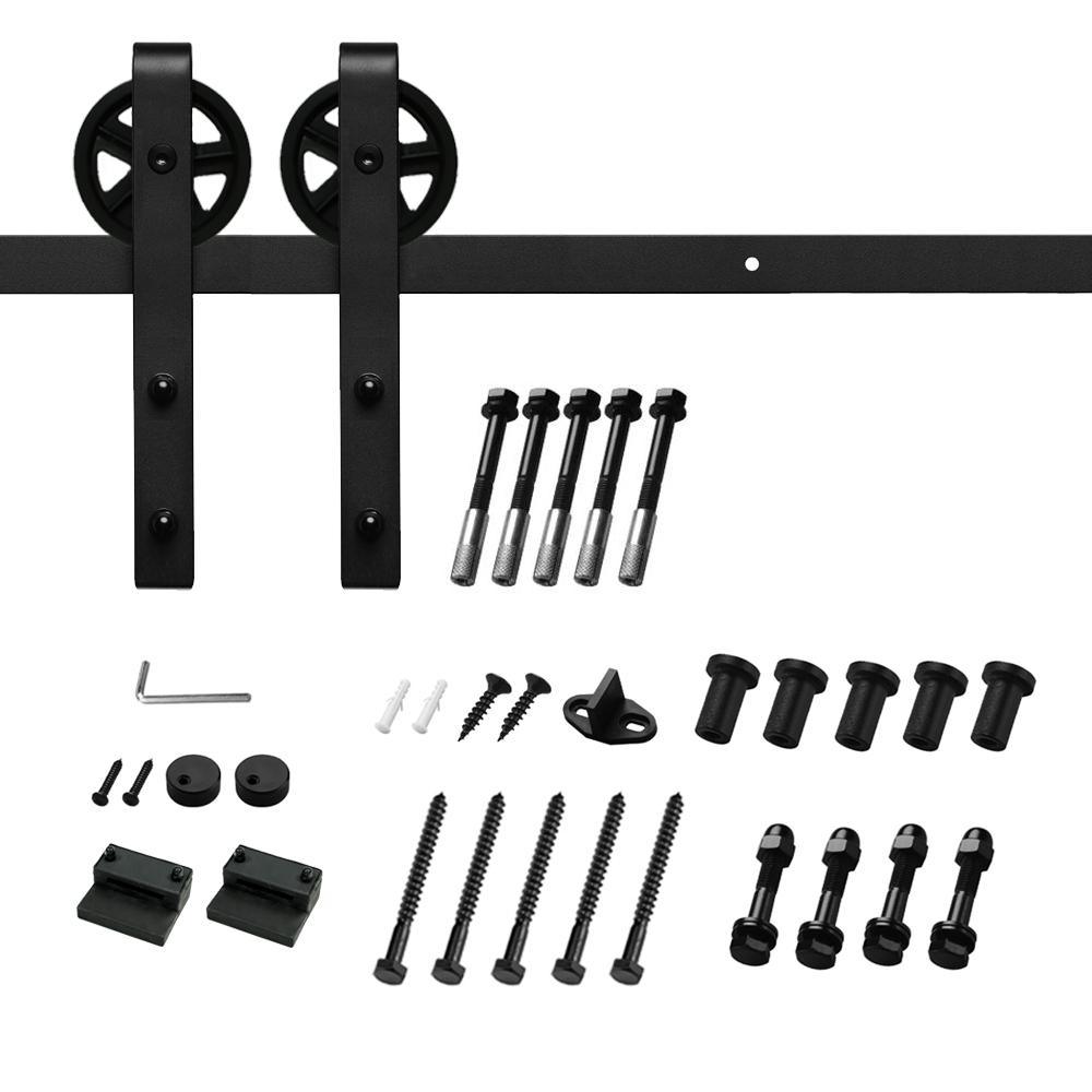 8 ft./96 in. Black Sliding Barn Door Track and Hardware Kit (Bigwheel J Shape Hanger) for Single Door with Floor Guide
