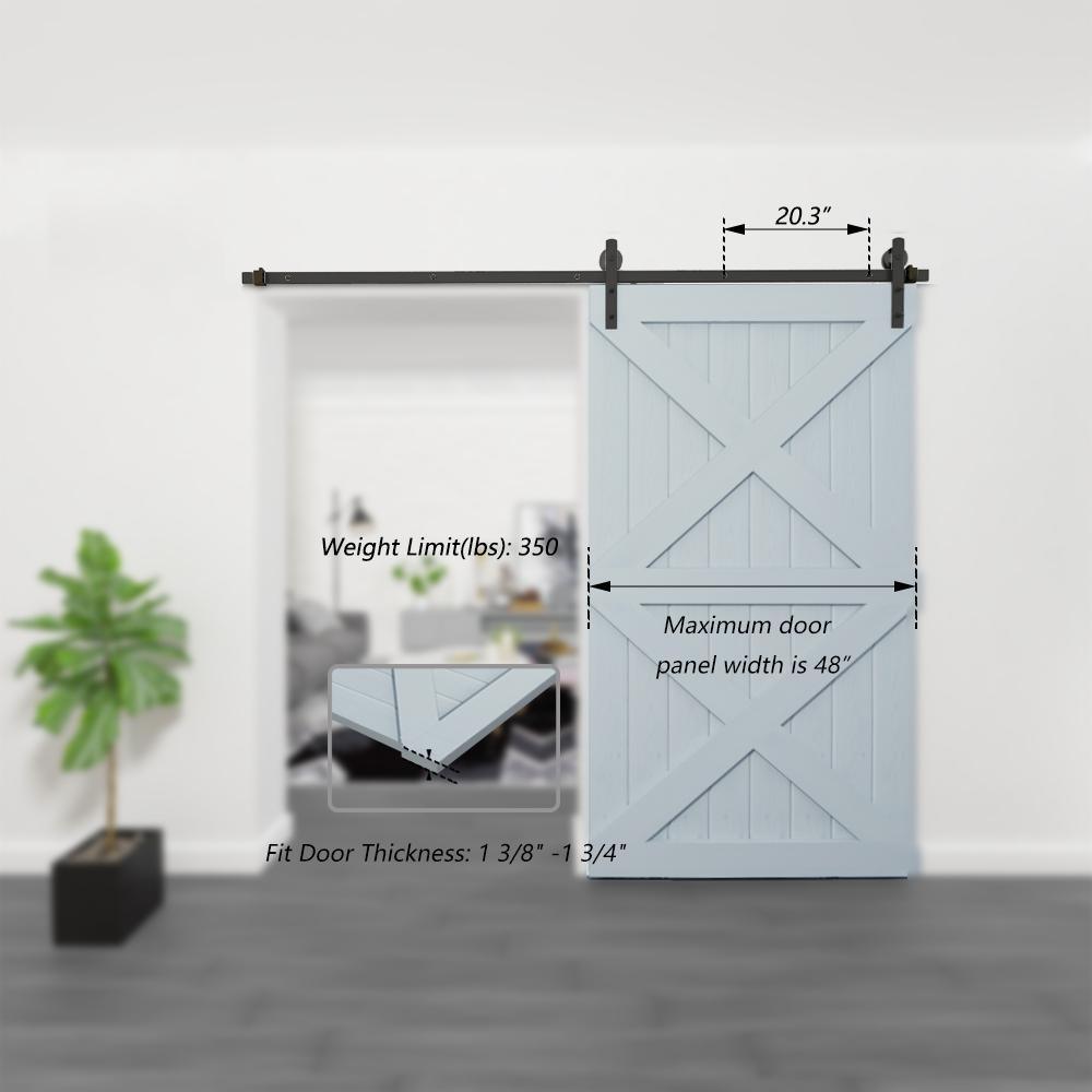 • Pre-install notice: 1) only the hardware is for sale, doors are not included, 2) the hardware package has lag bolts for wooden walls, 3) our sliding barn door hardware kit is compatible with door thickness from 1-3/8 in. to 1-3/4 in. 4) if you have a door trim, you would better put a header board that is as thick as the trim and then attach the rail to the header board, 5) you need to have at least 5 in. of space between the top of the door to the ceiling to accommodate the hardware, 6) we use 2 hangers to hold 1 door, for a single door kit, there will be 2 hangers in the package, for a double door kit, there will be 4 hangers, if you have a door that is either too wide or too heavy, then you can purchase additional hangers for that door