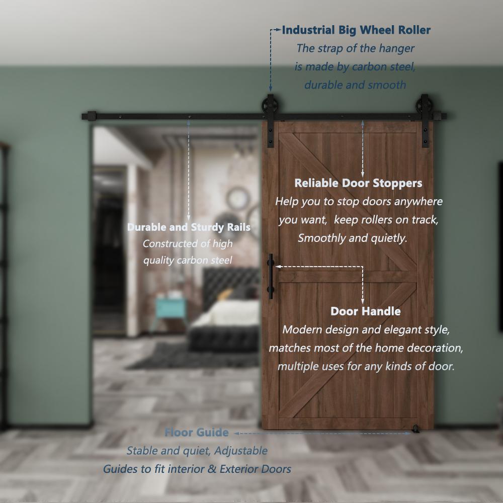• Package included: barn door hardware kit, (1 x 8 ft. rails, 2 x J-shape hanger, 4 x rail spacer, 1 x 12 in. square pull handle set, 1 x single roller floor guide, 1 x T-shaped floor guide, 2 x door stop, 2 x end cap, 1 x hex key) all assembly hardware is included as you see in the pictures, door not included