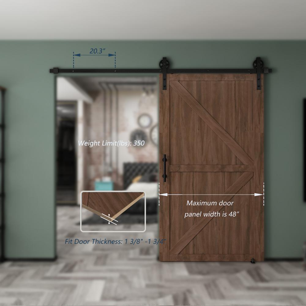 • Pre-install notice: 1) only the hardware is for sale, doors are not included, 2) the hardware package has lag bolts for wooden wall, 3) our sliding barn door hardware kit is compatible with door thickness from 1-3/8 in. to 1-3/4 in. 4) if you have a door trim, you would better put a header board that is as thick as the trim and then attach the rail to the header board, 5) you need to have at least 8 in. of space between the top of the door to the ceiling to accommodate the hardware, 6) we use 2 hangers to hold 1-door, for a single door kit, there will be 2 hangers in the package, for a double door kit, there will be 4 hangers, if you have a door that is either too wide or too heavy, then you can purchase additional hangers for that door