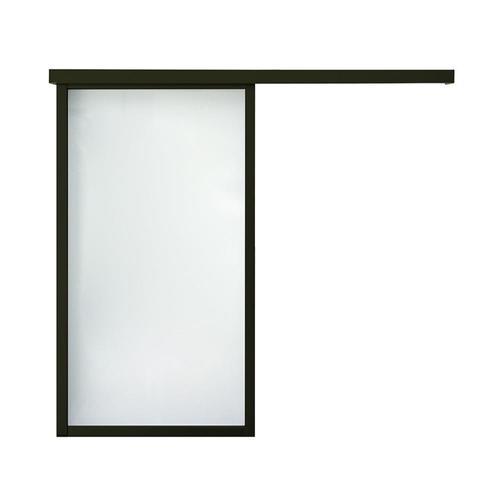 Wall sliding barn door with commercial grade Java finished aluminum frame with opaque white glass insert, ideal for finished openings that are 36-in wide x 96-in high A minimum header space of 3-in above the finished opening is required to install the top track (Track hardware: 76.125-in wide x 3.3-in high x 2.147-in deep) Fingerprint resistant laminated safety glass Surface mounted design is easy to install Wall sliding doors conserve space where a hinged doors swing would be impractical Glass doors with an elegant urban design that allow natural light to pass thru Use for closet, room divider, or passage door applications Ball bearing top rollers are adjustable for easy door alignment and provide smooth and quite operation Package includes all hardware and fasteners