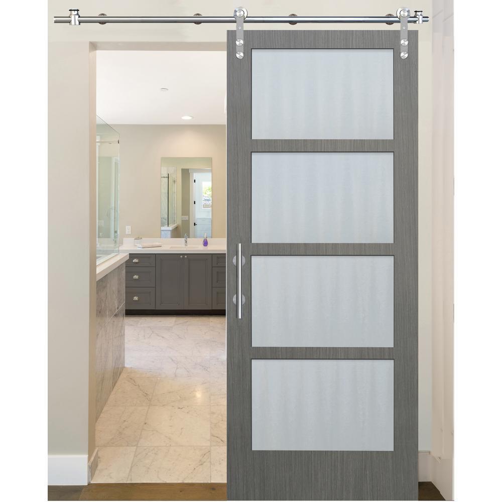 36 in. x 84 in. 4-Lite Driftwood Clear Coat Interior Sliding Barn Door with Round Stainless Steel Hardware Kit