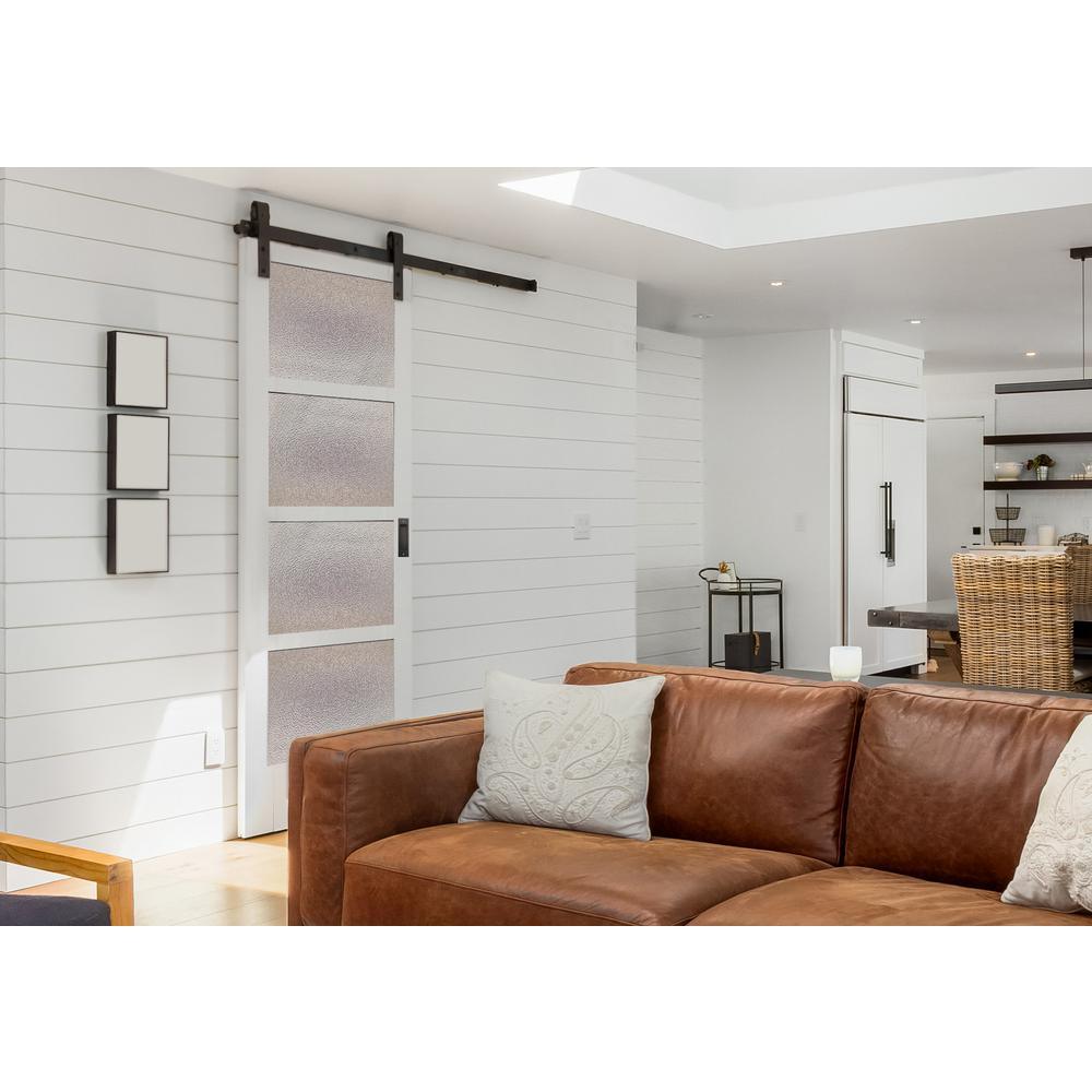 A beautiful way to enhance your dining, study, kitchen or bedroom areas, barn doors provide an elegant transition between spaces. This Pacific Entries stunning 30 in. x 84 in. 4 Lite Wood pre-primed barn door is constructed with solid core engineered stiles and rails for long-term trouble free performance, durability and beauty for years of enjoyment. 1-3/8 in. thick construction resists warping. Ready to paint in color of choice.