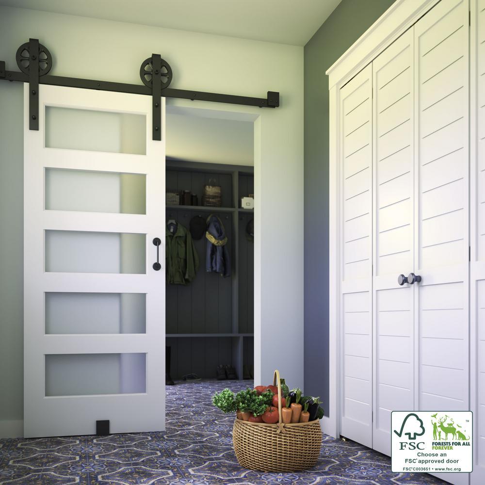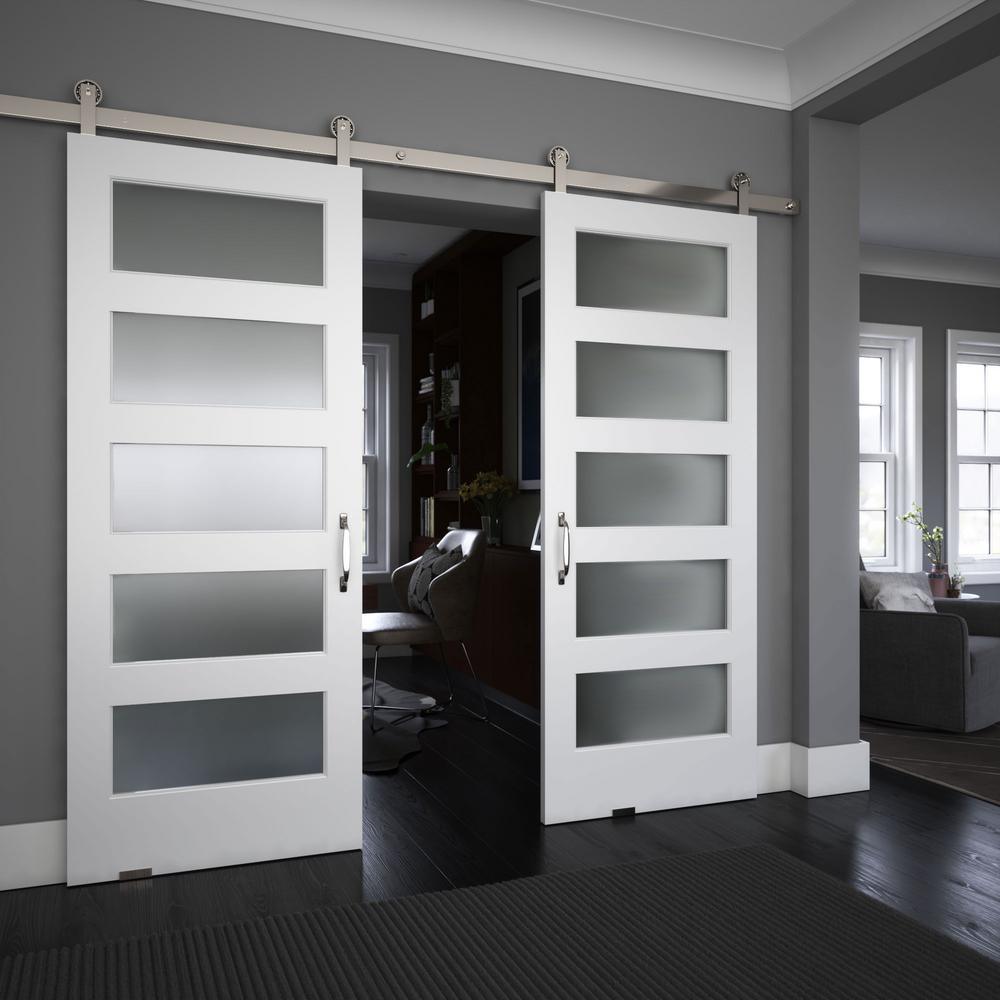 • Add light and privacy to any room with this modern 5-lite frosted interior barn door style
