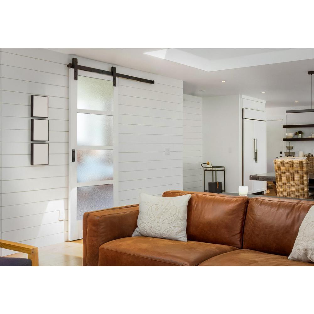 A beautiful way to enhance your dining, study, kitchen or bedroom areas, barn doors provide an elegant transition between spaces. This Pacific Entries stunning 36 in. x 84 in. 4 Lite Wood pre-primed barn door is constructed with solid core engineered stiles and rails for long-term trouble free performance, durability and beauty for years of enjoyment. 1-3/8 in. thick construction resists warping. Ready to paint in color of choice.