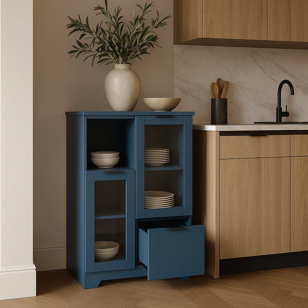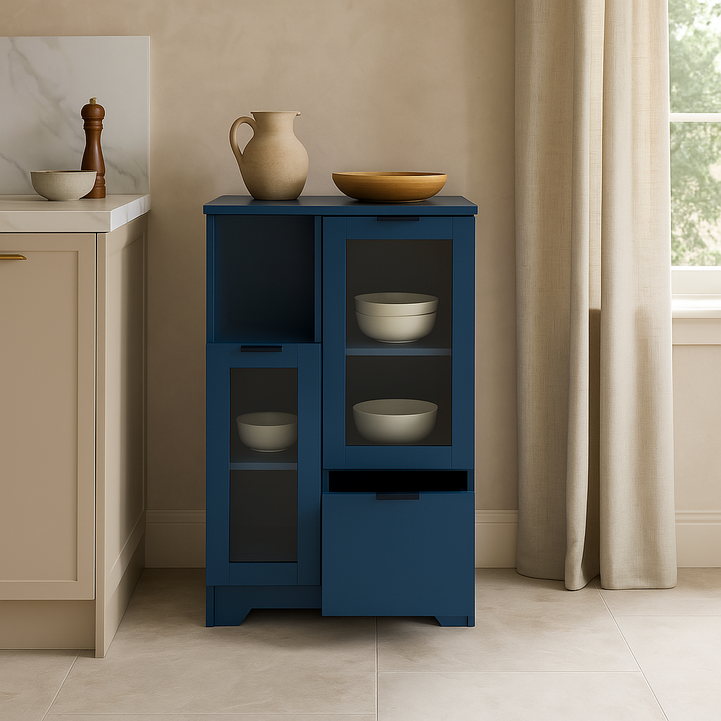 This navy blue MDF cabinet combines modern elegance and practicality, featuring glass doors, adjustable shelves, and a drawer for versatile storage. Its durable construction and sleek design make it a perfect addition to any room.
