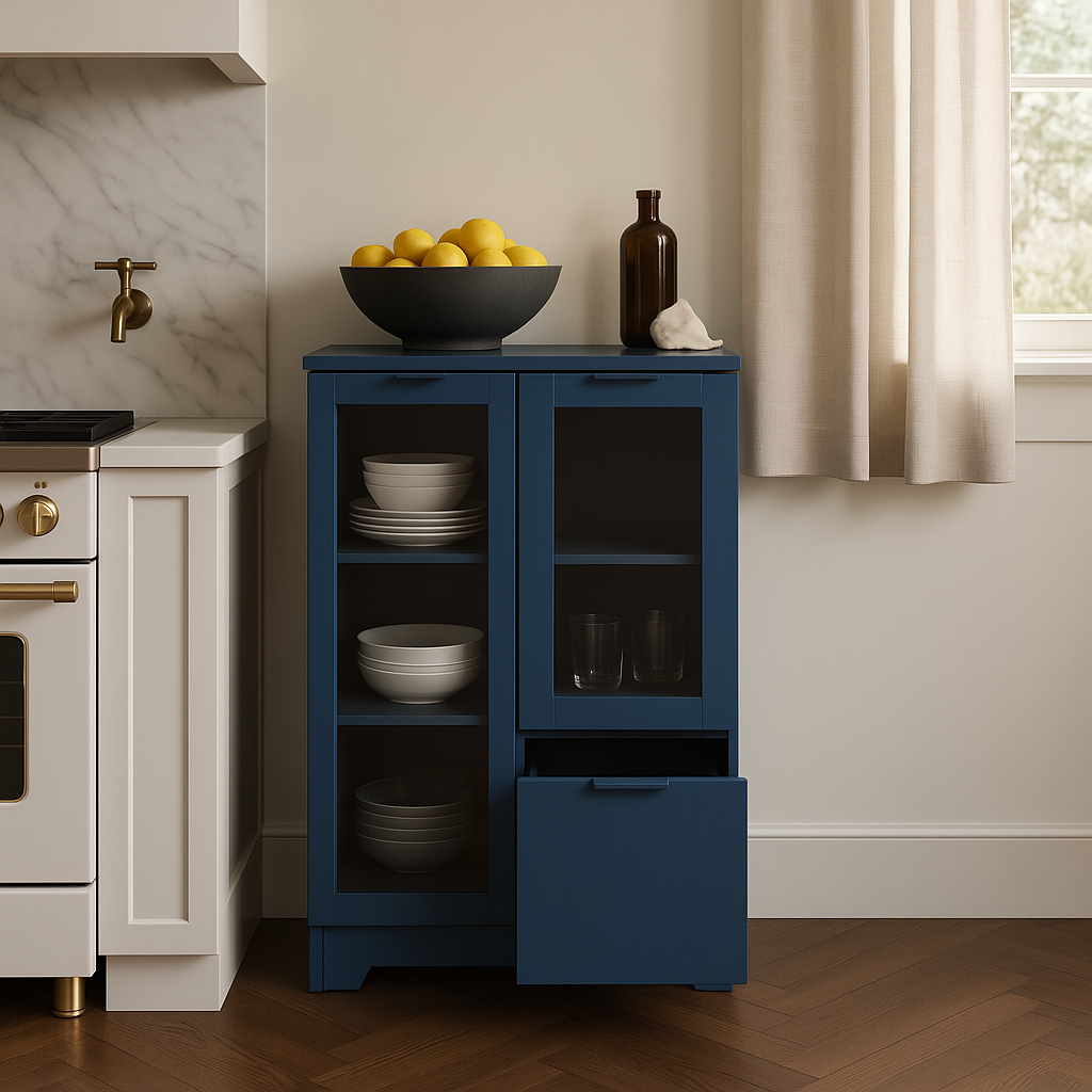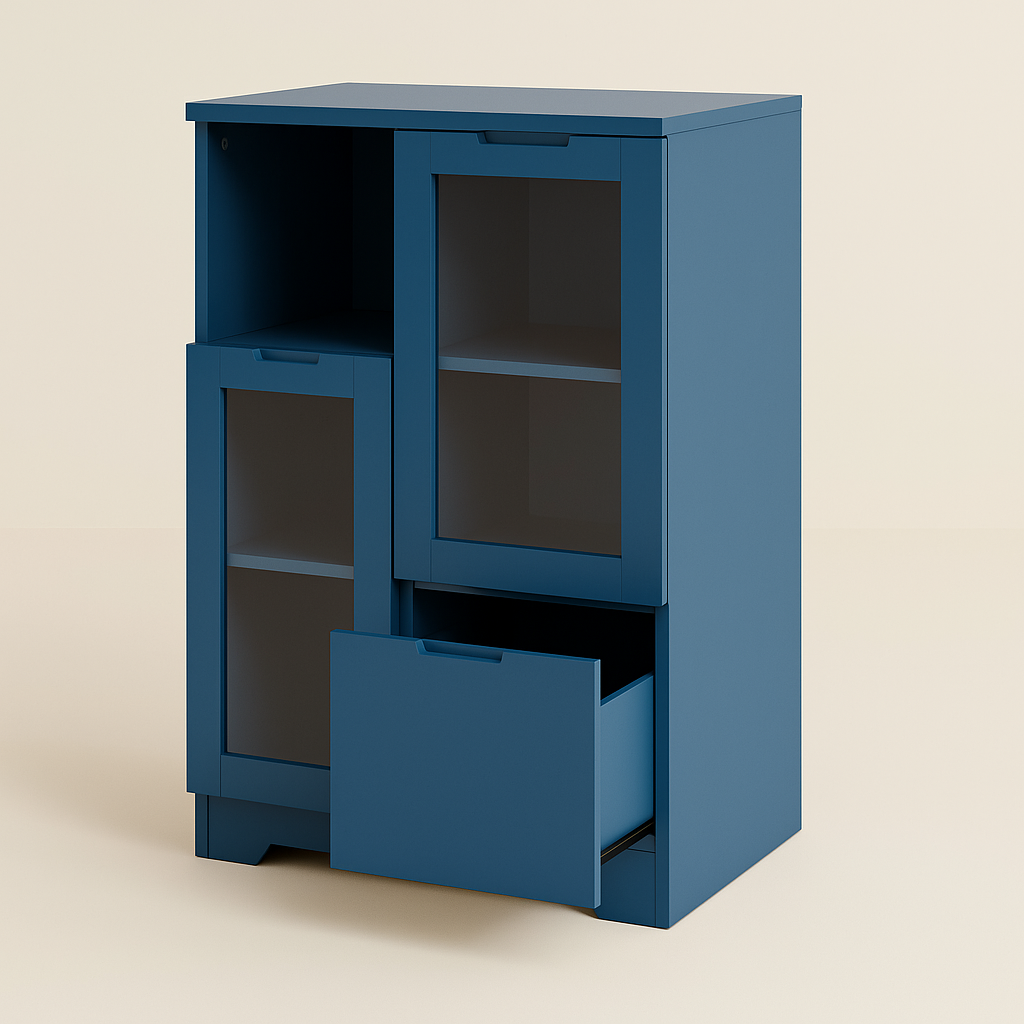• Stylish Design: Navy blue finish with glass doors for a modern look.